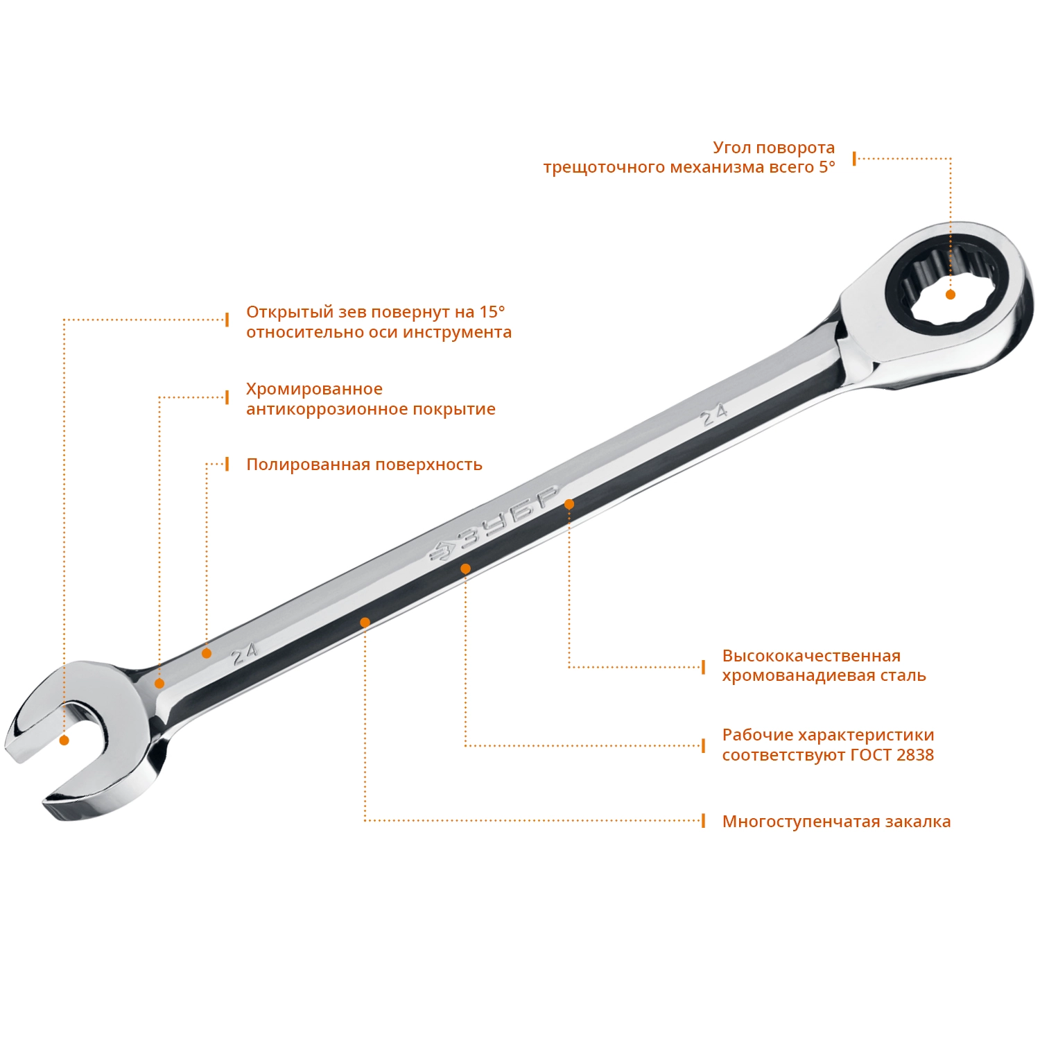 ПроизводителиКлюч комбинированный трещоточный 24мм (27074-24) ЗУБР