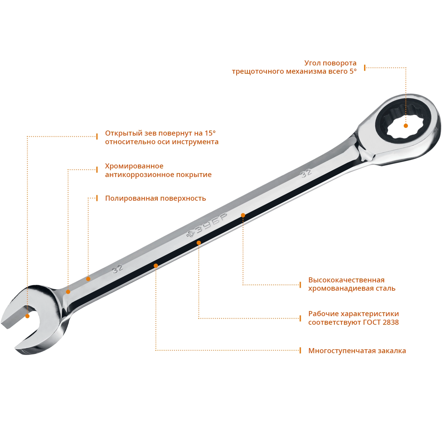 ПроизводителиКлюч комбинированный трещоточный 32мм (27074-32) ЗУБР