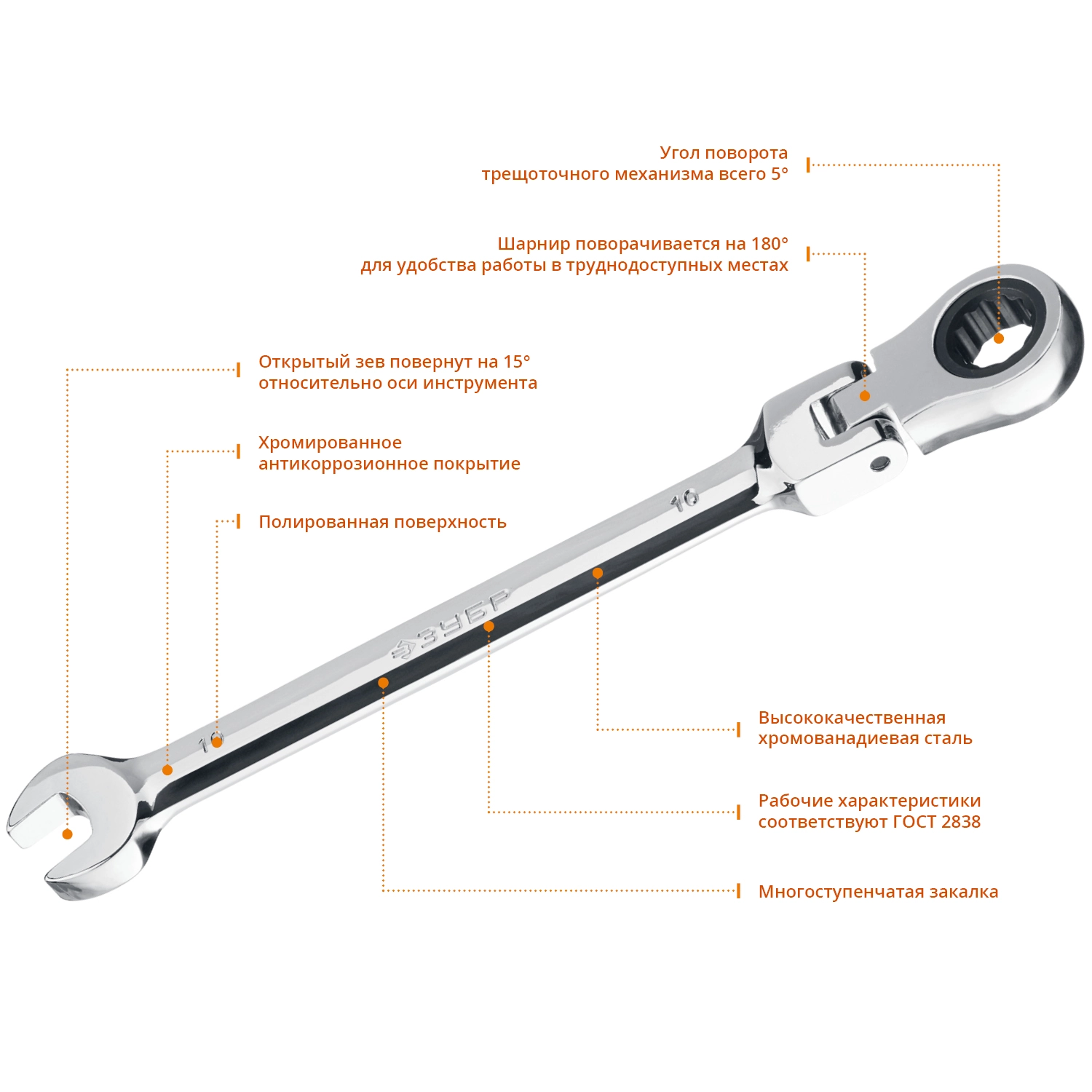 ПроизводителиКлюч комбинированный трещоточный шарнирный 10мм (27101-10) ЗУБР