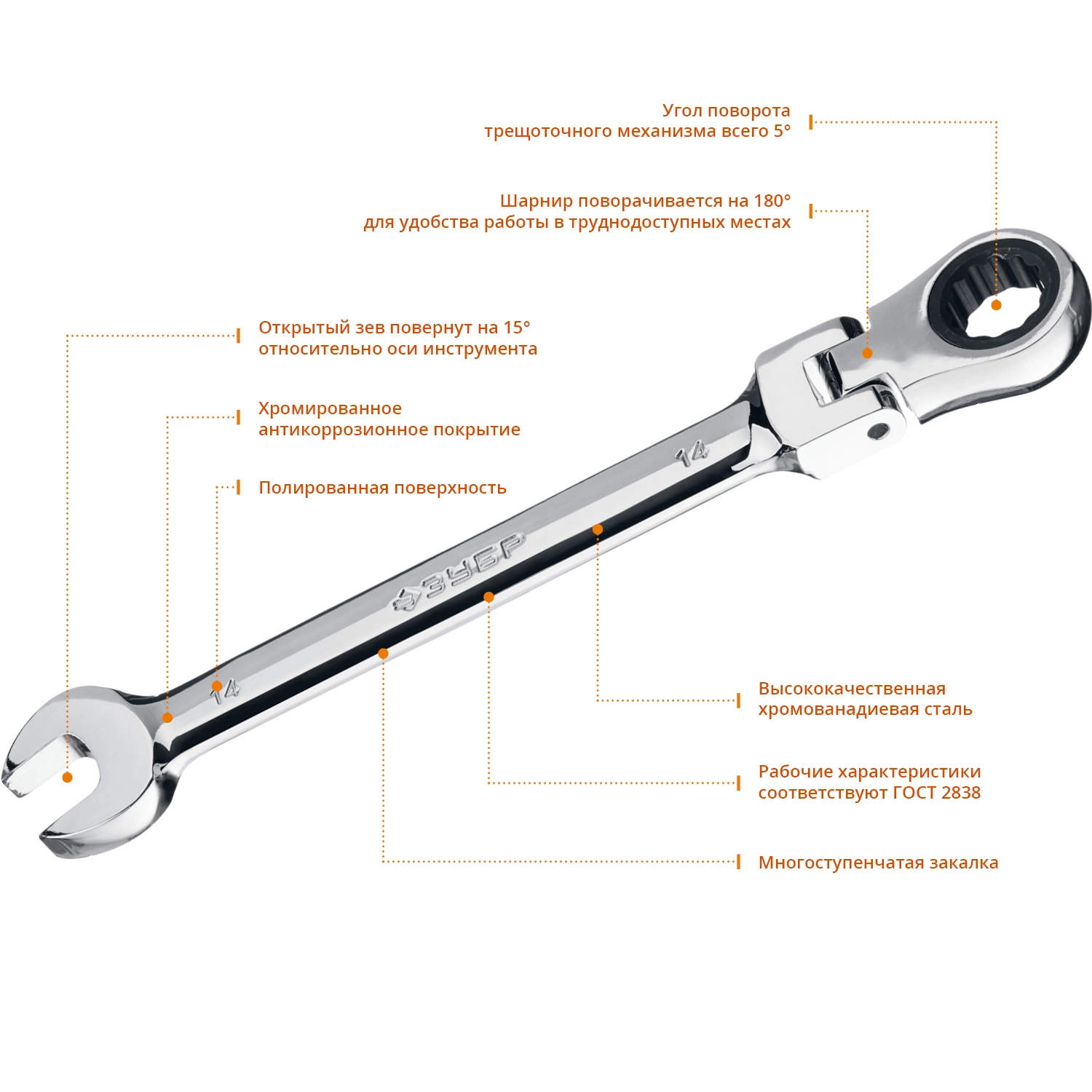 ПроизводителиКлюч комбинированный трещоточный шарнирный 14мм (27101-14) ЗУБР