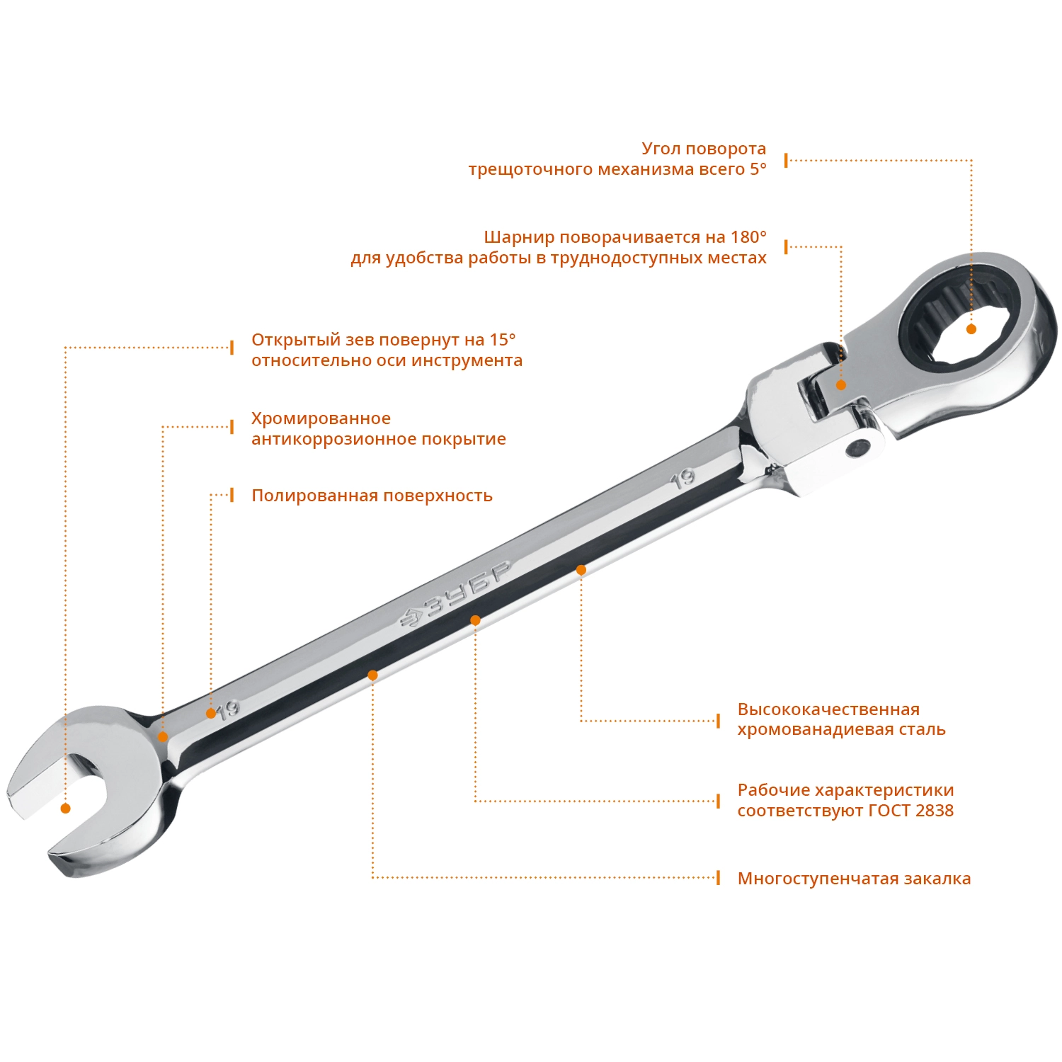 ПроизводителиКлюч комбинированный трещоточный шарнирный 19мм (27101-19) ЗУБР