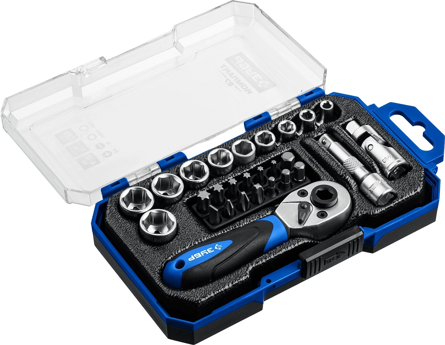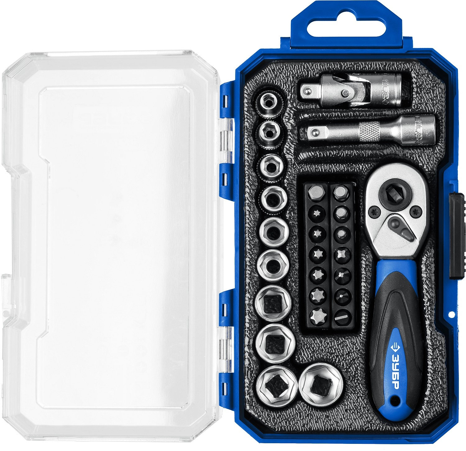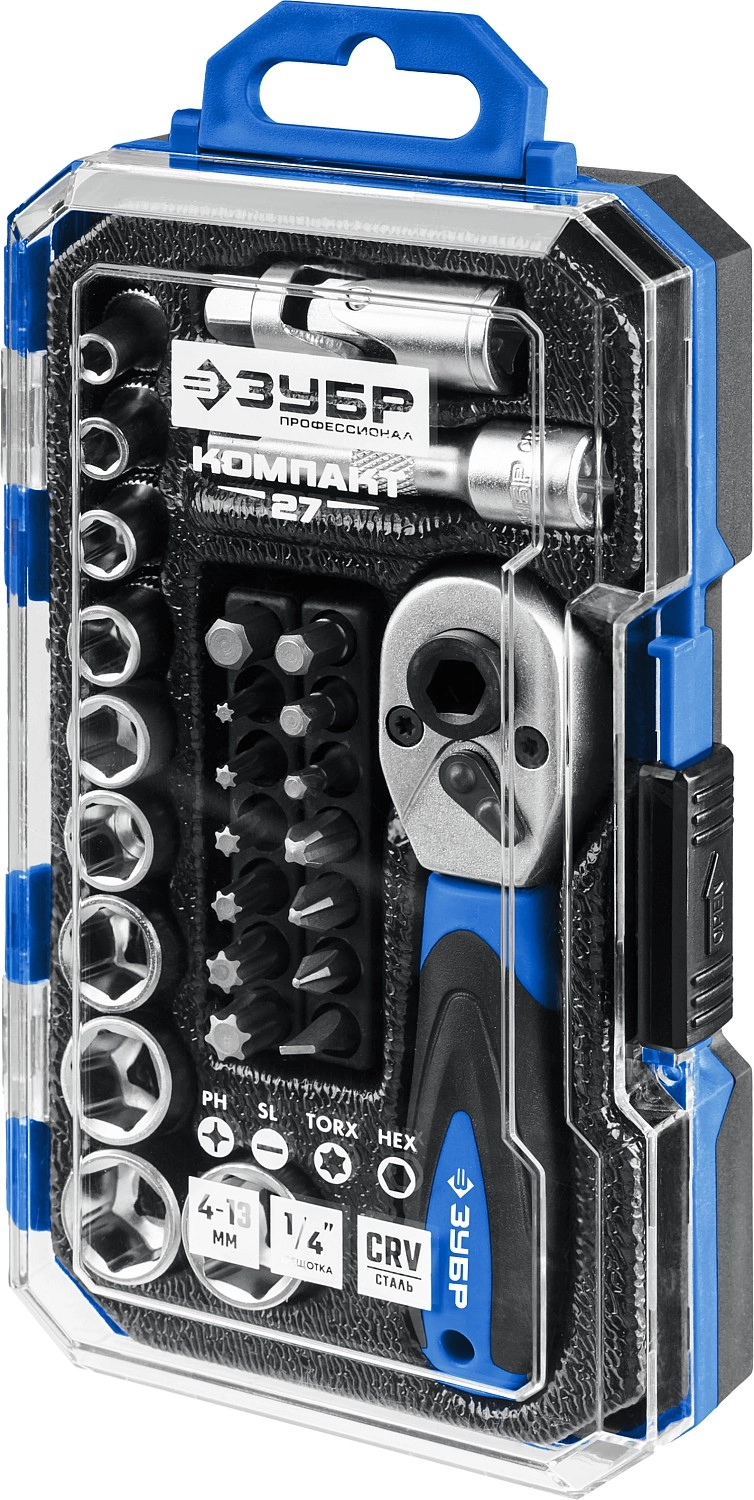 ПроизводителиНабор головок с трещоткой, битами и удлинителем 1/4" 4-13мм, 27пр. (27642-H27_z01) ЗУБР