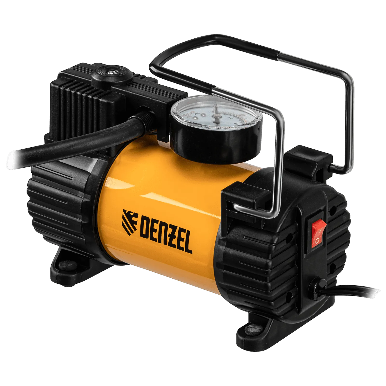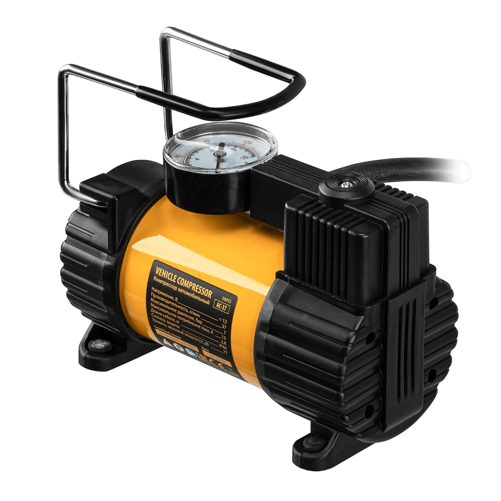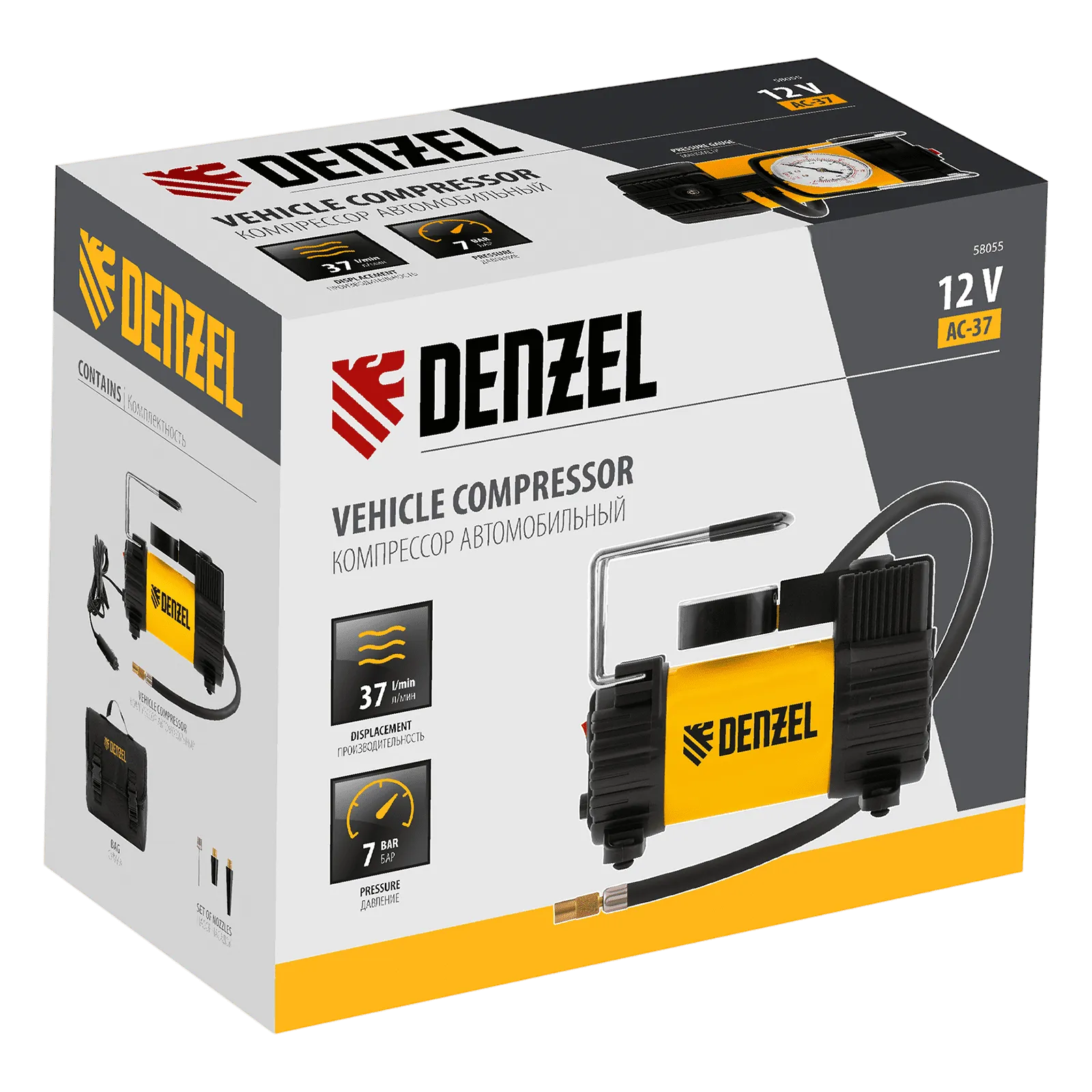 Автомобильный компрессор Denzel AC-37 58055 с автомобильным предохранителем работает от бортовой сети 12 В, обеспечивает давление 7 атмосфер и производительность 37 л/мин.