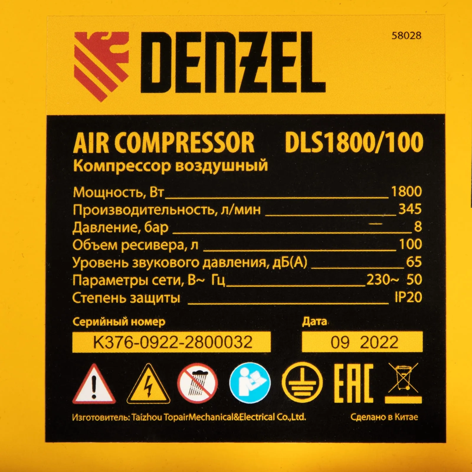 ХарактеристикиАртикул 58028Бренды DENZELСтрана производства КитайТип поршневойОбъем ресивера 100Тип двигателя электрическийВес 71.5Тип смазки безмасляныйПривод прямойПроизводительность на входе 345Количество цилиндров 6Количество ступеней сжатия 1Уровень шума 65Описание товара обновлено 08.12.2025 14:51:59Безмасляный малошумный компрессор Denzel DLS 1800/100 58028 мощностью 1800 (3 х 600) Вт, объемом ресивера 100 л и производительностью 345 л/мин предназначен для обеспечения пневмоинструмента сжатым воздухом, подаваемым под давлением до 8 бар. Позволяет подключить пневматический заклепочник, дрель, шлифмашину и т.д. Оптимален для работы с краскопультом и для продувки электронных компонентов, т. к. в сжатом воздухе отсутствуют частицы масла. Компрессор пригодится в мастерской, гараже, на строительной площадке.