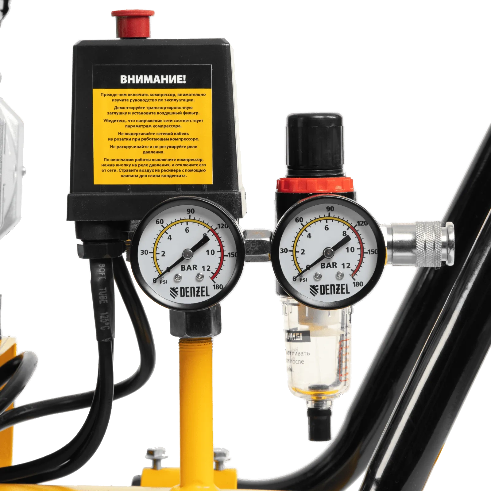 - Контроль давления в ресивере и на выходной магистрали — компрессор оборудован двумя манометрами.