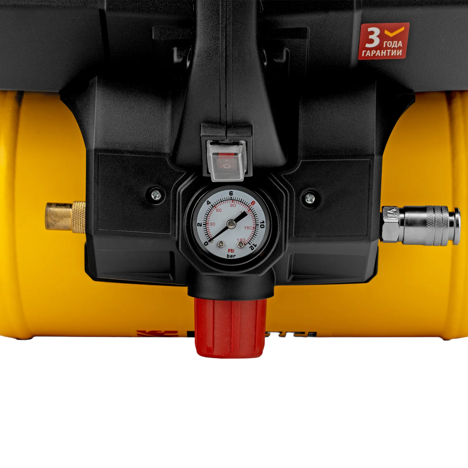 - Удобный контроль давления в ресивере — на компрессор установлен механический манометр, «смотрящий» вверх, поэтому для снятия показаний не нужно присаживаться.