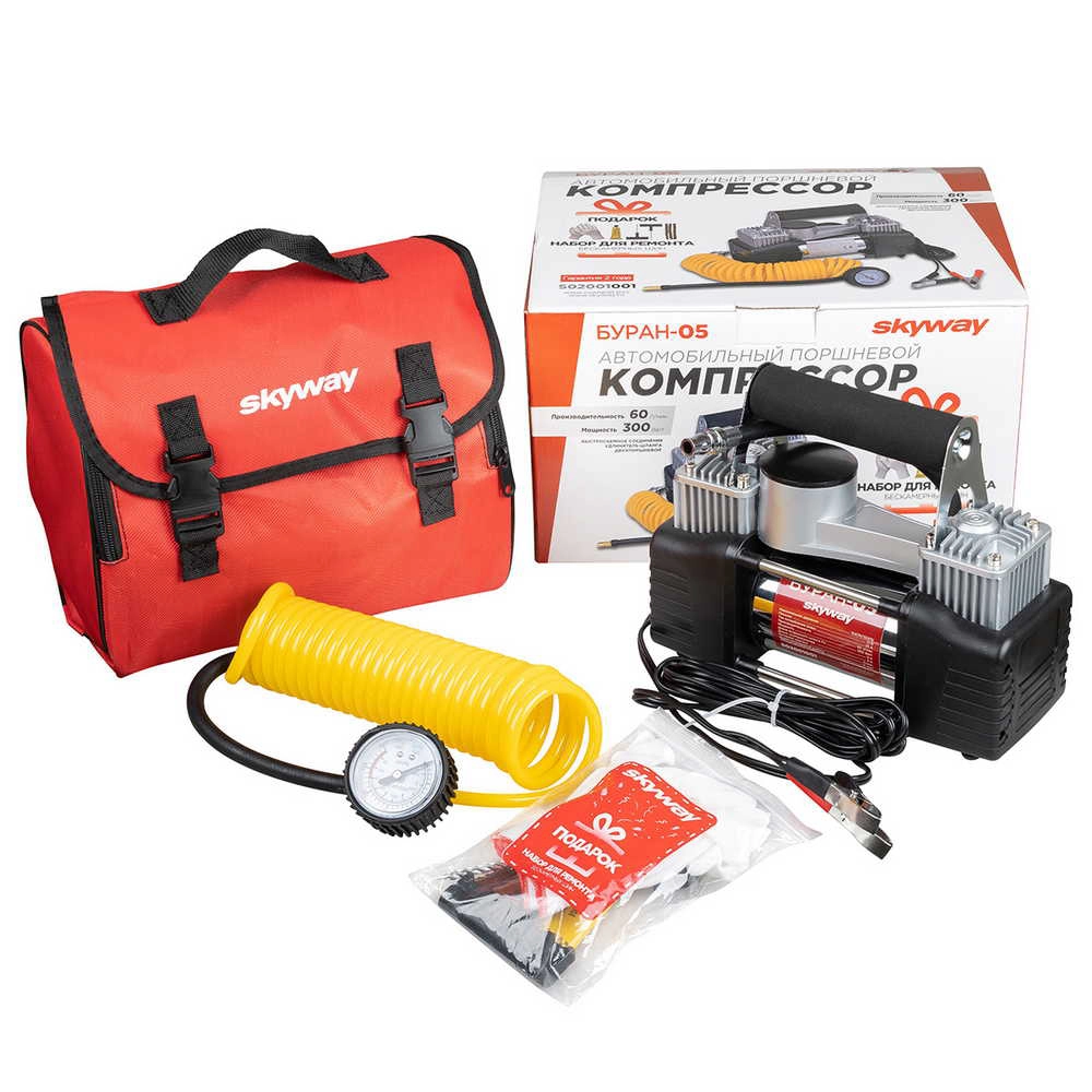 Компрессор металлический 60л/мин 2х поршневой с крокодилами SKYWAY БУРАН-05 в сумке 10 АТМ + подарок - это автомобильный компрессор профессионального уровня в металлическом корпусе, работающий от аккумулятора. Благодаря двухпоршневой системе при совсем небольших размерах мощность компрессора составляет 60 л/мин. Мощный поршневой механизм с компрессионным кольцом из жароустойчивого и прочного тефлона обеспечивают его долговечность и стабильную работу. За счет удобной сумки с ручкой и фастексами, длинного замка-молнии компрессор легко и быстро доставать или переносить. Хранение в сумке позволяет уберечь его от случайных повреждений и загрязнений. Использованные высококачественные материалы обеспечивают гибкость шланга и кабеля при низких температурах, высокую защиту от износа, заломов, растрескивания. Входящий в комплект шланг-"гармошка" длиной 5 м оборудован двухшкальным точным манометром для контроля давлениПроизводитель: