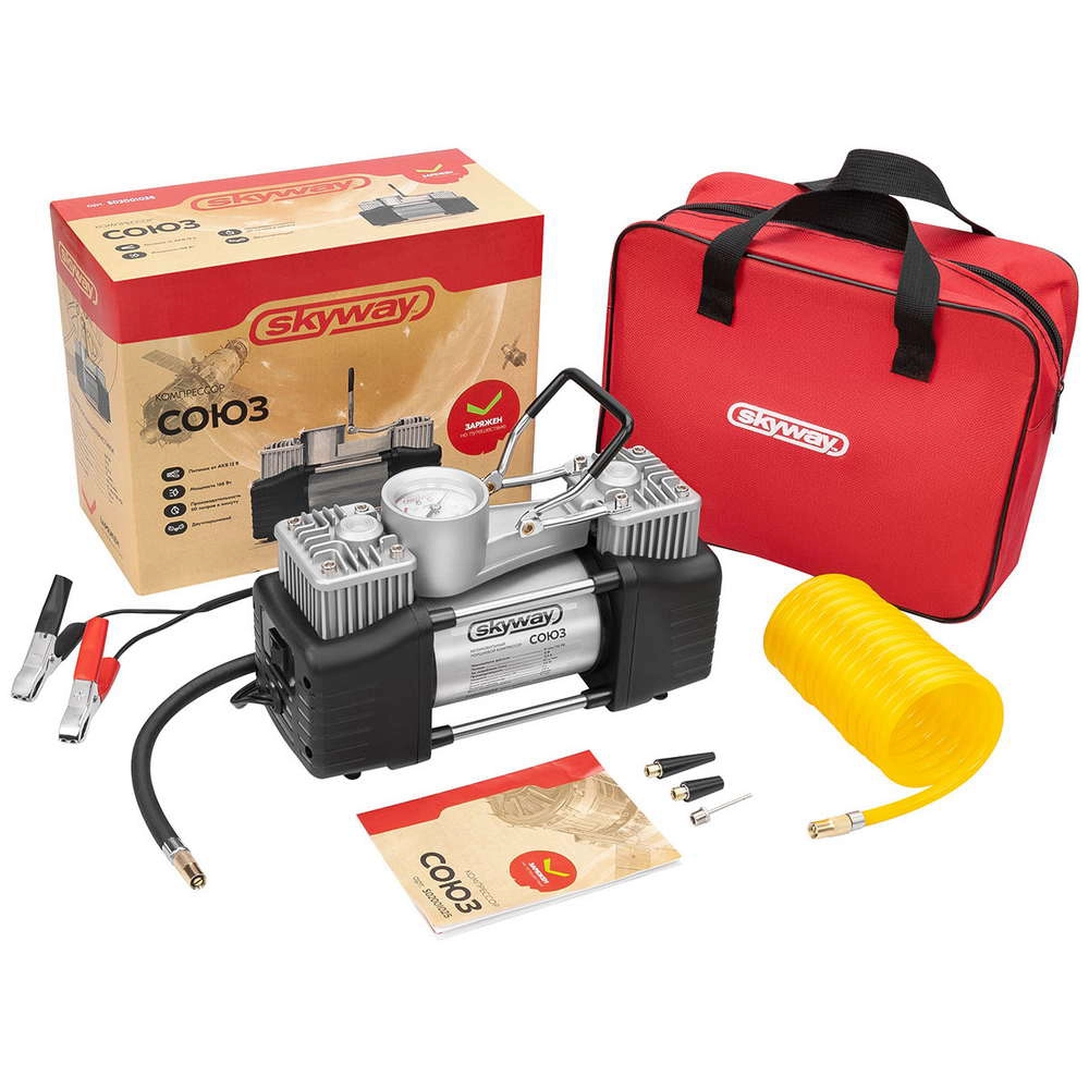 ПроизводителиКомпрессор метал. 60л/мин 2х поршн. с крокодилами СОЮЗ 10 АТМ, в сумке (S02001025) SKYWAY