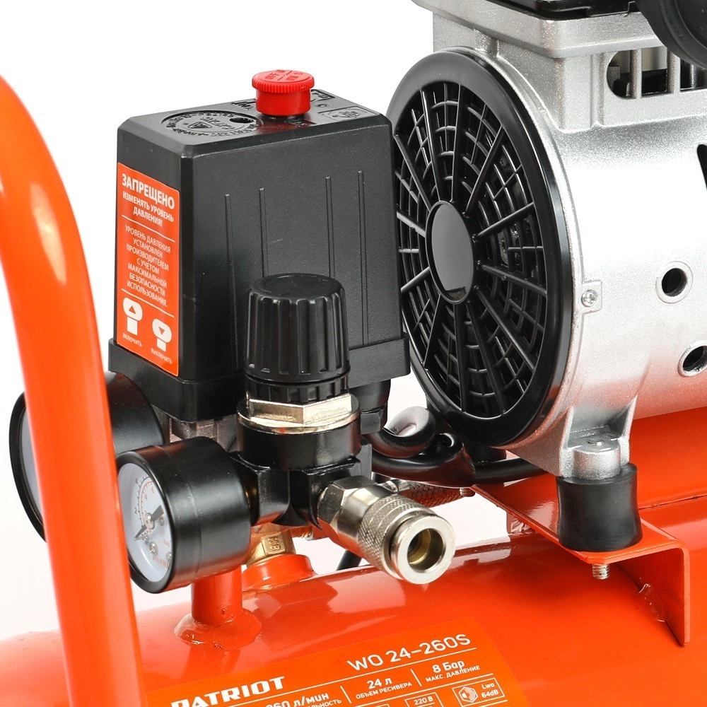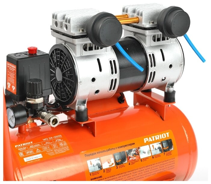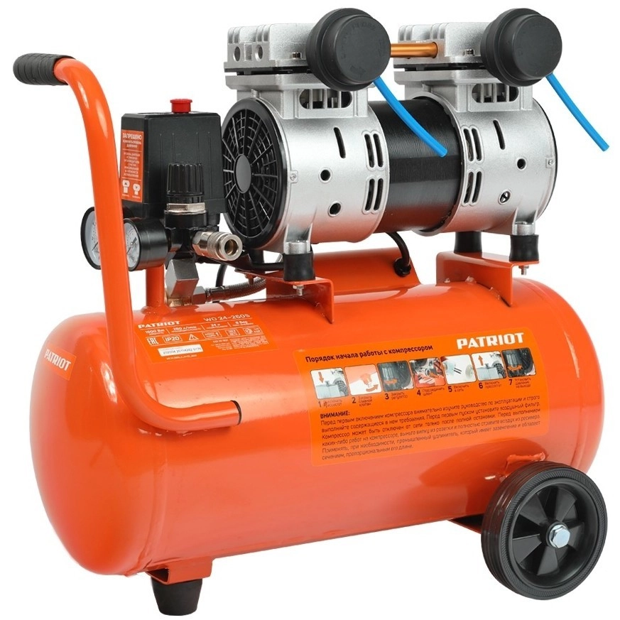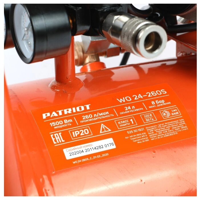 СТАНДАРТУровень качества. При классификации продуктов, имеющих схожее наименование, но обладающие различными потребительскими свойствами мы приняли следующий Вес факторов: 80% - подтвержденный ресурс, 15% - заявленная производительность/скорость, 5% - субъективные ощущения потребителя. ПодробнееКод товара: 0062434(0)ХарактеристикиАртикул 525301921Бренды PATRIOTСтрана производства КитайГарантия 24 месяцевГабариты (ШхВхГ),мм 570х580х260Тип поршневойПотребляемая мощность 1500Рабочее давление, Бар 8Цвет оранжевыйОбъем ресивера 24Колеса естьРегулировка давления ДаТип смазки безмасляныйПривод прямойПроизводительность на выходе 260Давление 8Напряжение 220Количество цилиндров 2Количество ступеней сжатия 1Максимальное число оборотов 2850Описание товара обновлено 08.12.2025 15:23:09Напряжение - 220 В Рабочее давление - 8 бар Число оборотов - 2850 об/мин Производительность на входе - 260 л/мин Объем ресивера - 24 л Тип компрессора - поршневой коаксиальный (прямой привод) Мощность (кВт) - 1.5 Мощность (л.с.) - 2.04 Транспортировочные колеса - да Тип смазки - безмасляный Тип соединения - рапид (EURO) Частотный преобразователь - нет Количество выходов - 1 Тип двигателя - электрический Кабель питания в комплекте - есть Min уровень шума - 64 дБ Цилиндры - 2 Ступени - 1 Комплектация Компрессор УпаковкаПроизводитель: 11th Flooor,LiYuanShangdu Building A2,201# LanTian Road,NingBo China