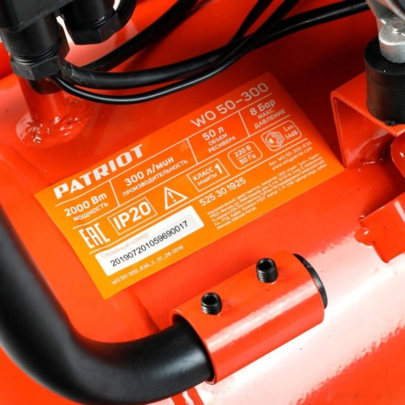 СТАНДАРТУровень качества. При классификации продуктов, имеющих схожее наименование, но обладающие различными потребительскими свойствами мы приняли следующий Вес факторов: 80% - подтвержденный ресурс, 15% - заявленная производительность/скорость, 5% - субъективные ощущения потребителя. ПодробнееКод товара: 0062433ХарактеристикиАртикул 525301925Бренды PATRIOTСтрана производства КитайГарантия 24 месяцевТип поршневойПотребляемая мощность 2000Рабочее давление, Бар 8.11Число оборотов холостого хода 2850Цвет оранжевыйОбъем ресивера 50Тип двигателя электрическийКолеса естьВес 36Тип смазки безмасляныйПривод прямойПроизводительность на входе 300Количество цилиндров 4Количество ступеней сжатия 1Уровень шума 54Описание товара обновлено 08.12.2025 15:23:14Напряжение - 220 В Рабочее давление - 8.11 бар Производительность на входе - 300 л/мин Объем ресивера - 50 л Тип компрессора - поршневой коаксиальный (прямой привод) Мощность (кВт) - 2 Мощность (л.с.) - 2.72 Транспортировочные колеса - да Тип смазки - безмасляный Тип соединения - рапид (EURO) Количество выходов - 2 Тип двигателя - электрический Кабель питания в комплекте - есть Min уровень шума - 54 дБ Цилиндры - 4 Ступени - 1 Комплектация Компрессор УпаковкаПроизводитель: 11th Flooor,LiYuanShangdu Building A2,201# LanTian Road,NingBo China