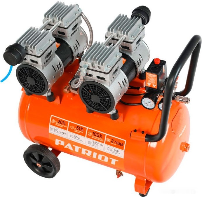 ХарактеристикиАртикул 525301925Бренды PATRIOTСтрана производства КитайГарантия 24 месяцевТип поршневойПотребляемая мощность 2000Рабочее давление, Бар 8.11Число оборотов холостого хода 2850Цвет оранжевыйОбъем ресивера 50Тип двигателя электрическийКолеса естьВес 36Тип смазки безмасляныйПривод прямойПроизводительность на входе 300Количество цилиндров 4Количество ступеней сжатия 1Уровень шума 54Описание товара обновлено 08.12.2025 15:23:14Напряжение - 220 В Рабочее давление - 8.11 бар Производительность на входе - 300 л/мин Объем ресивера - 50 л Тип компрессора - поршневой коаксиальный (прямой привод) Мощность (кВт) - 2 Мощность (л.с.) - 2.72 Транспортировочные колеса - да Тип смазки - безмасляный Тип соединения - рапид (EURO) Количество выходов - 2 Тип двигателя - электрический Кабель питания в комплекте - есть Min уровень шума - 54 дБ Цилиндры - 4 Ступени - 1 Комплектация Компрессор УпаковкаПроизводитель: 11th Flooor,LiYuanShangdu Building A2,201# LanTian Road,NingBo China