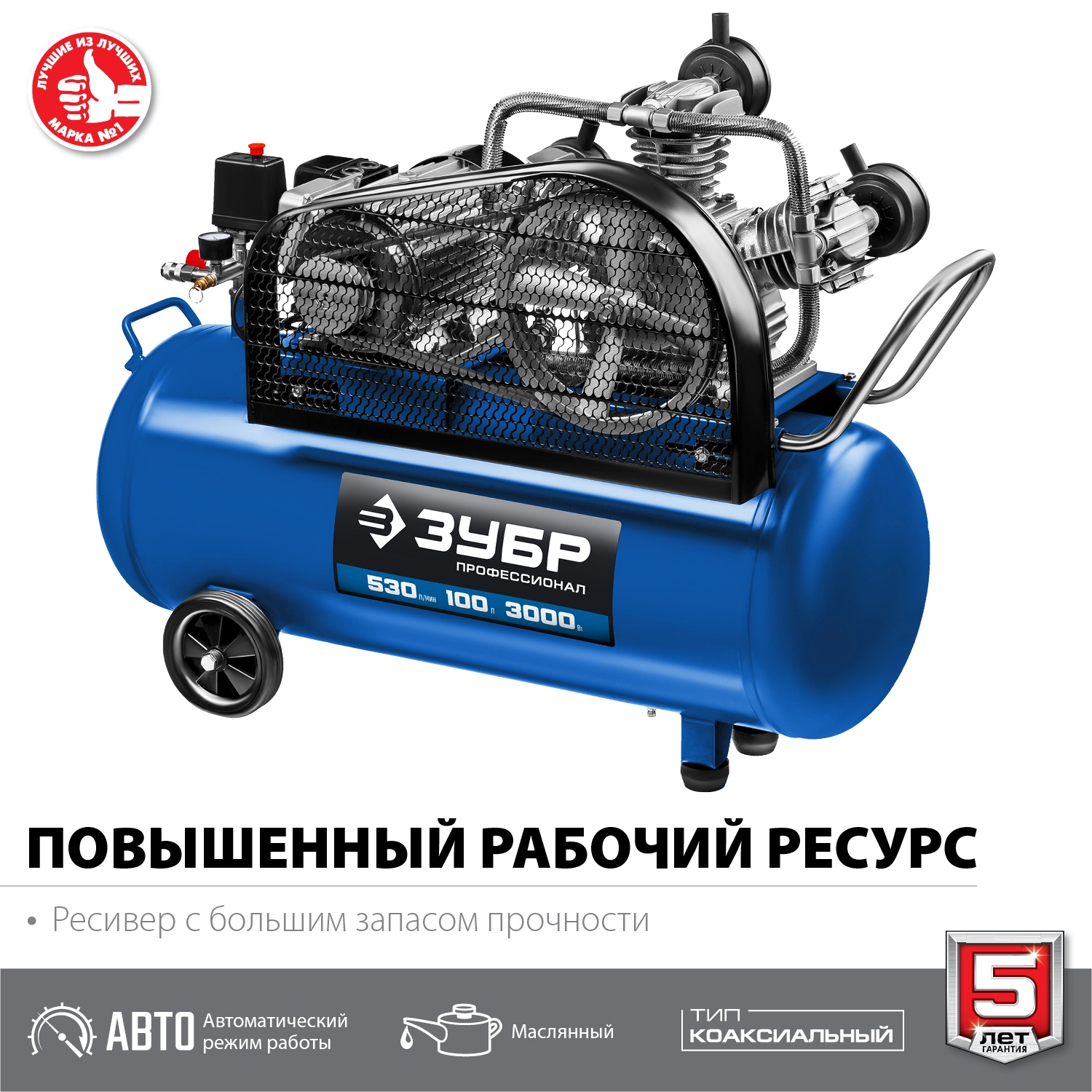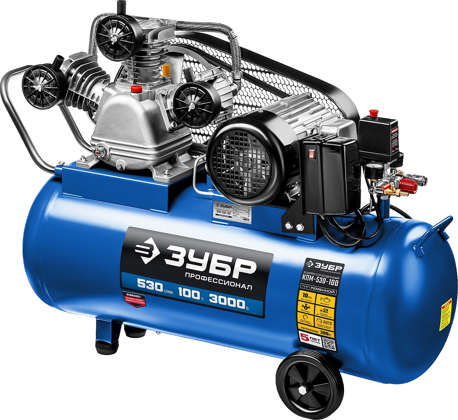 ПроизводителиКомпрессор ременной КПМ-530-100 (3000 Вт, 380 В, 530 л/мин, 100 л, кор.) ЗУБР