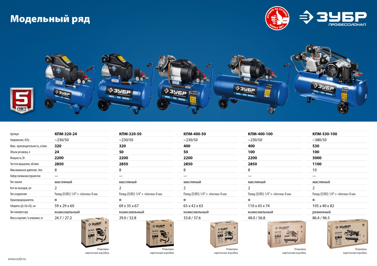 ПРОФИУровень качества. При классификации продуктов, имеющих схожее наименование, но обладающие различными потребительскими свойствами мы приняли следующий Вес факторов: 80% - подтвержденный ресурс, 15% - заявленная производительность/скорость, 5% - субъективные ощущения потребителя. ПодробнееКод товара: 0044288(1)ХарактеристикиАртикул КПМ-530-100Бренды ЗубрСтрана производства КитайПотребляемая мощность 3000Производительность 31800Компрессор ременной ЗУБР КПМ-530-100, предназначен для производства или строительства, могут использоваться с широким спектром пневматического инструмента и аксессуаров. Прямой привод. Два типа штуцеров «елочка» и быстросъемник ¼". Воздушный фильтр. Контроль давления в ресивере и на выходе. Термопредохранитель.