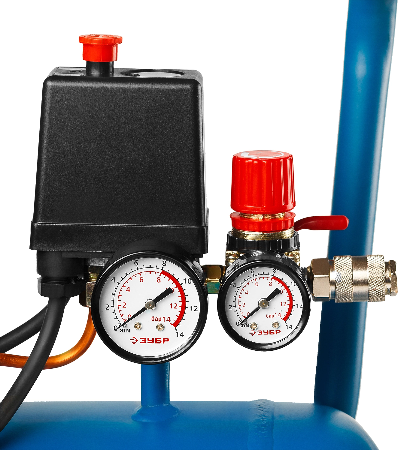 - Контроль давления в ресивере и на выходе при помощи двух манометров;