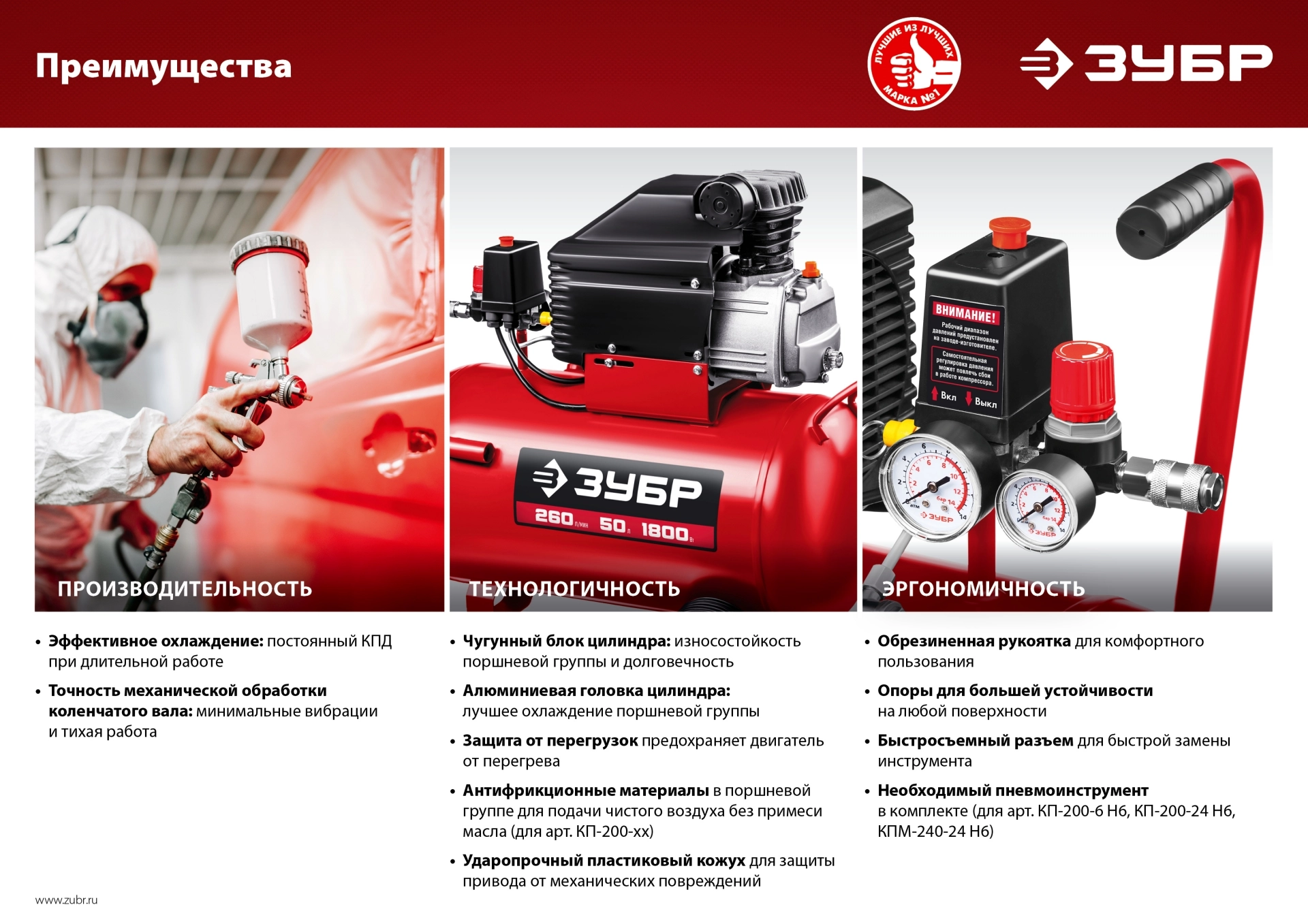 СТАНДАРТУровень качества. При классификации продуктов, имеющих схожее наименование, но обладающие различными потребительскими свойствами мы приняли следующий Вес факторов: 80% - подтвержденный ресурс, 15% - заявленная производительность/скорость, 5% - субъективные ощущения потребителя. ПодробнееКод товара: 0044279(2)ХарактеристикиАртикул КП-200-24 Н6Бренды ЗубрСтрана производства КитайПотребляемая мощность 1500Производительность 12000Компрессор воздушный ЗУБР КП-200-24 Н6, предназначен для накопления, хранения и подачи воздуха. Компактный и надежный безмасляный компрессор с поршневым типом пневматического механизма с оптимальным набором мневмоинтрументов. Готов к работе сразу после покупки. Вырабатываемый воздух не содержит примесей масла, что не требует установки дорогостоящих маслоотделителей. Не требует заправки маслом и контроля за наличием и его замены. Прямой привод упрощает конструкцию и увеличивает надежность. Выключатель давления обеспечивает автоматическое включение/выключение изделия при расходе сжатого воздуха. Сменный воздушный фильтр на входе защищает цилиндро-поршневую группу от абразивного износа. Быстросъемный штуцер обеспечивает удобное и быстрое подключение и отключение пневмоинструмента. Контроль давления в ресивере и на выходе при помощи двух манометров. Самовосстанавливающийся термопредохранитель. Регулировка давления на выходе позволяет настраивать давление воздуха зависимости от используемого пневмоинструмента.