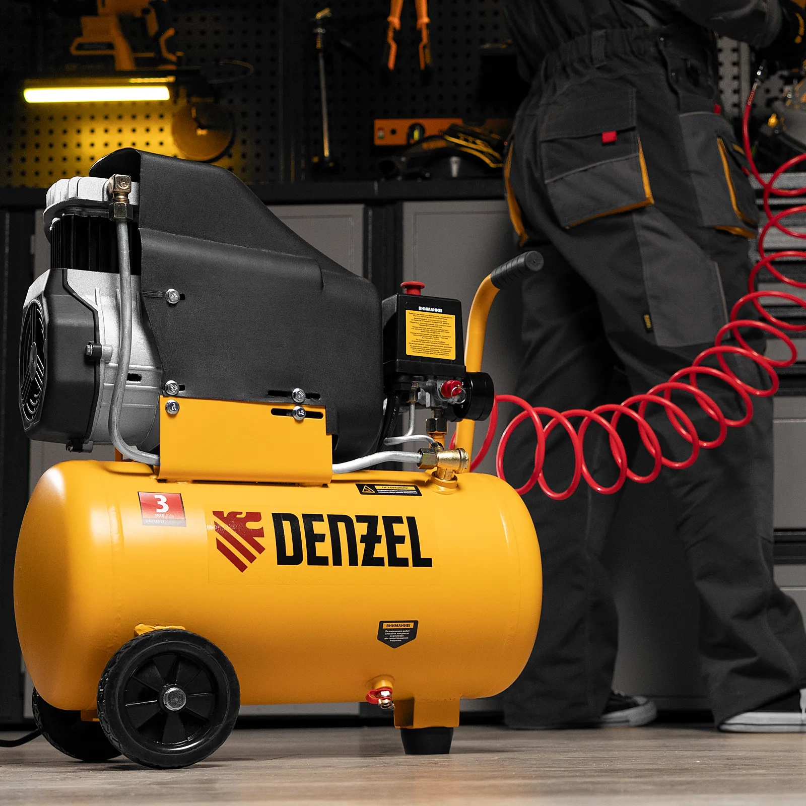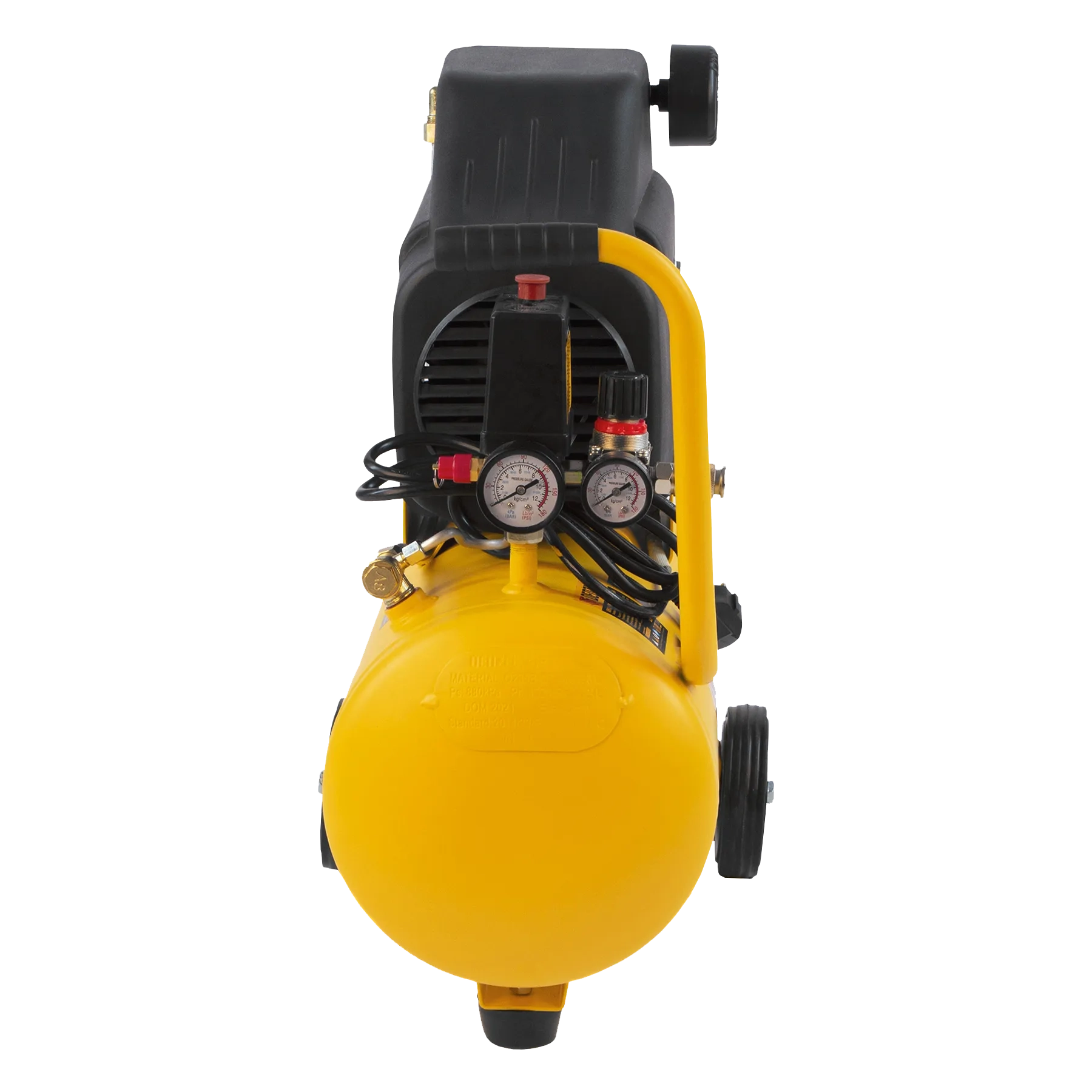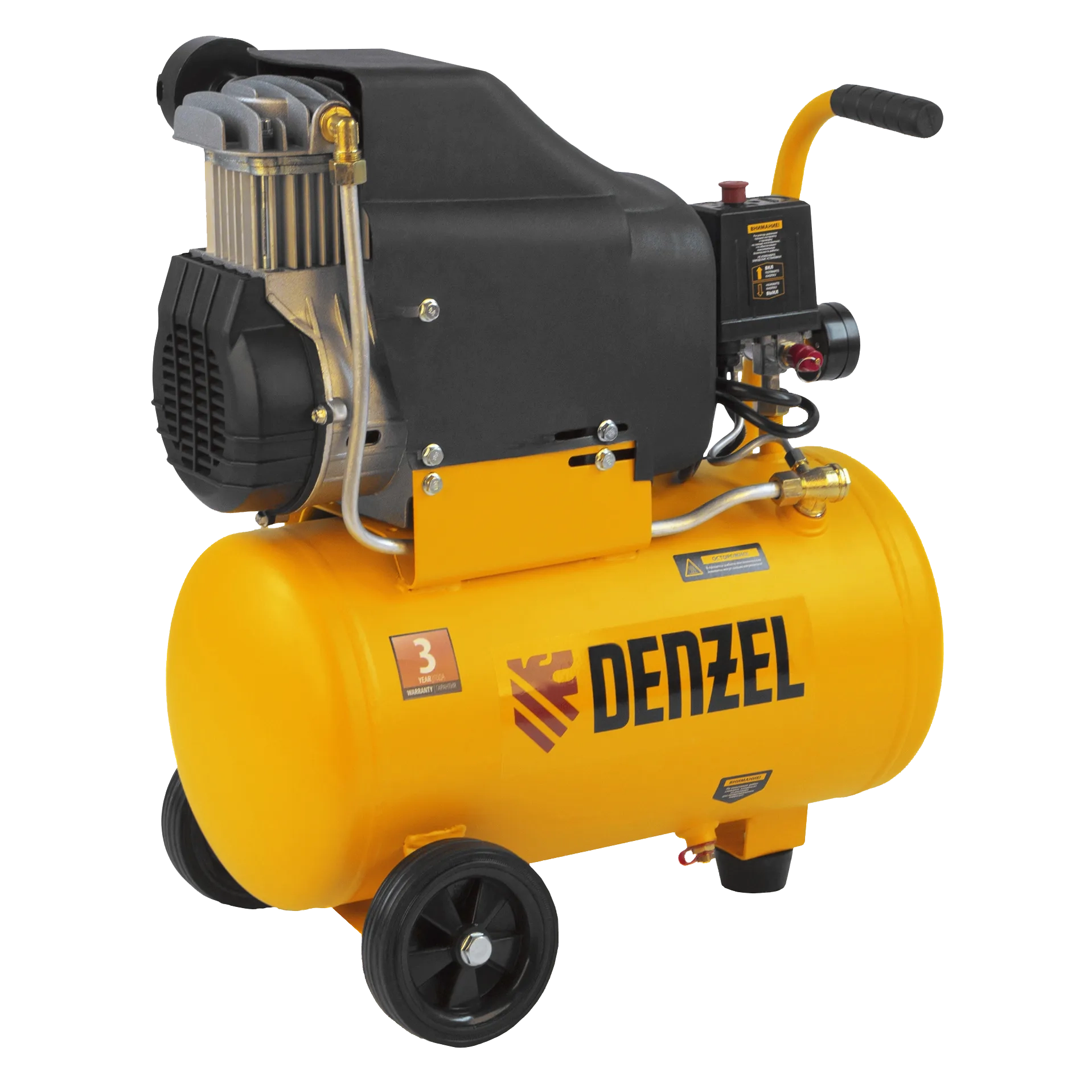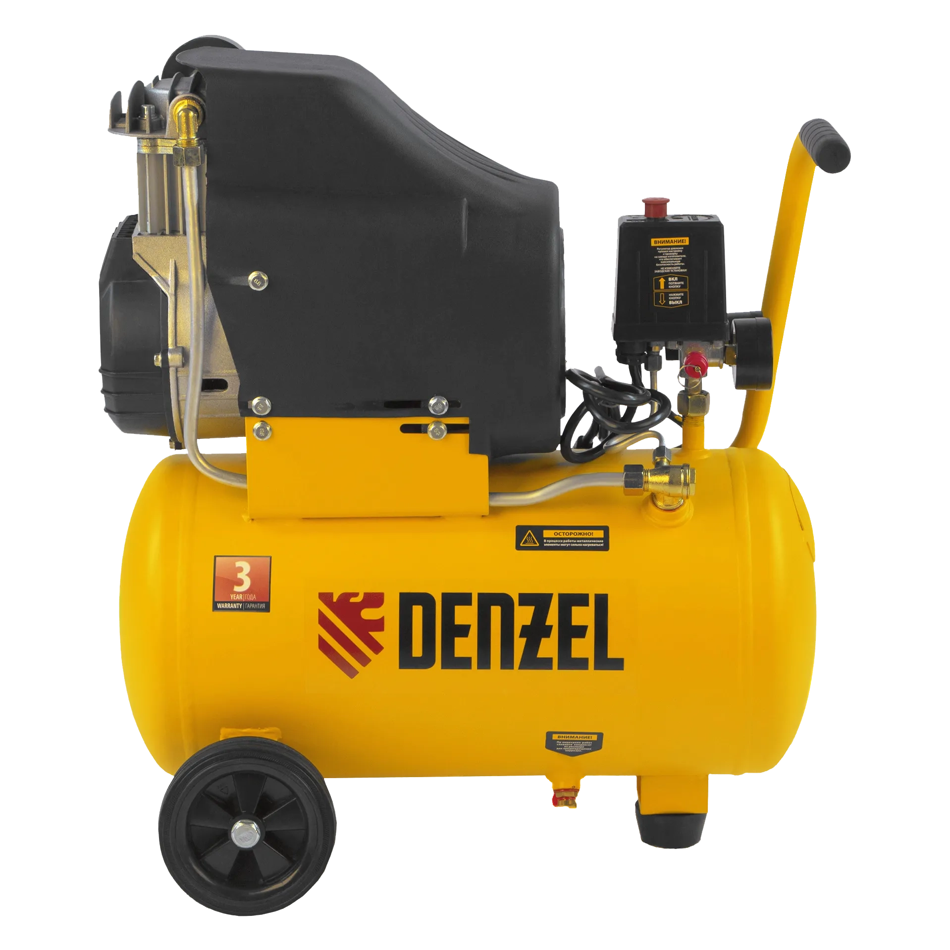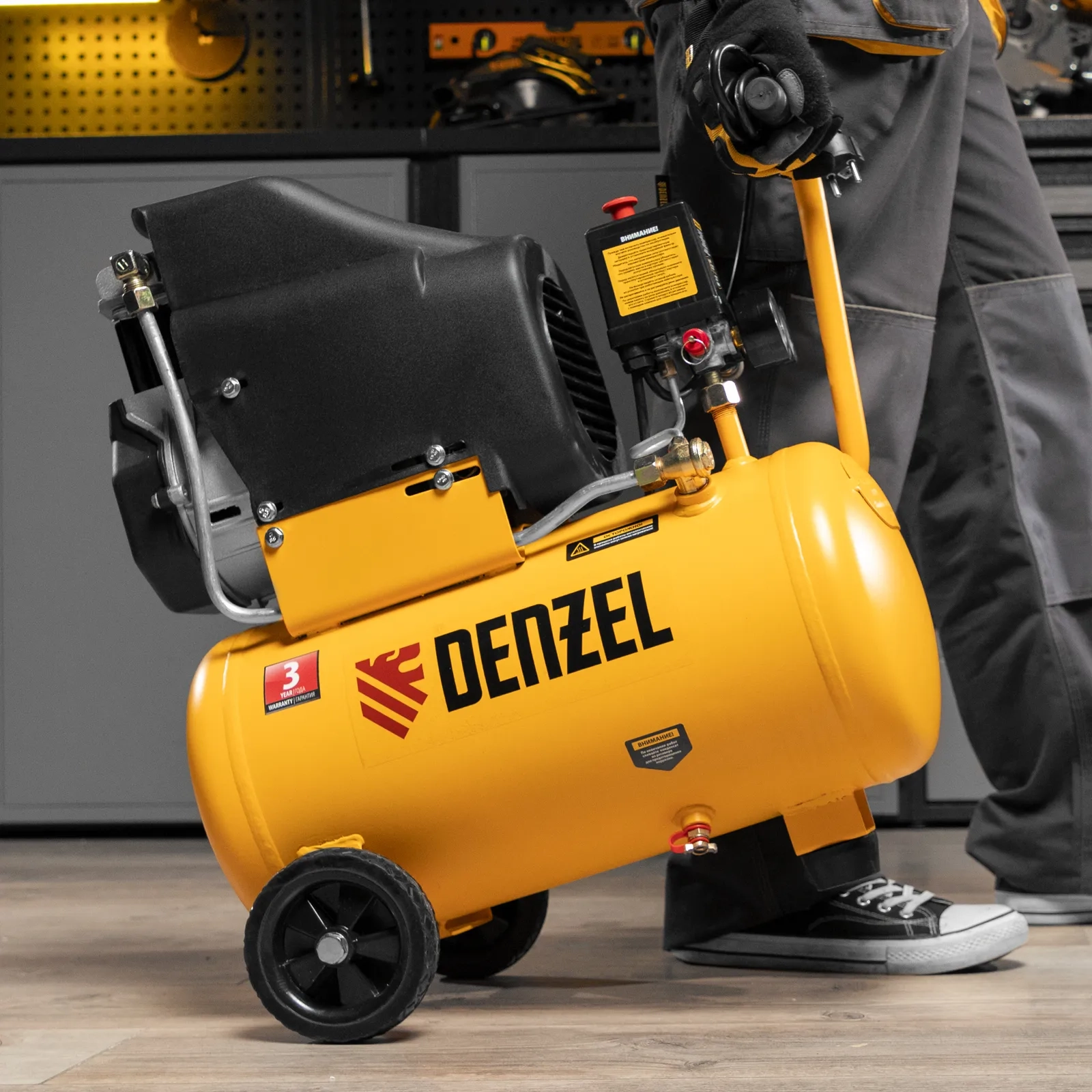 - Мобильность — компрессор, оснащенный ручкой и колесами, весит 22,6 кг, что упрощает его транспортировку.