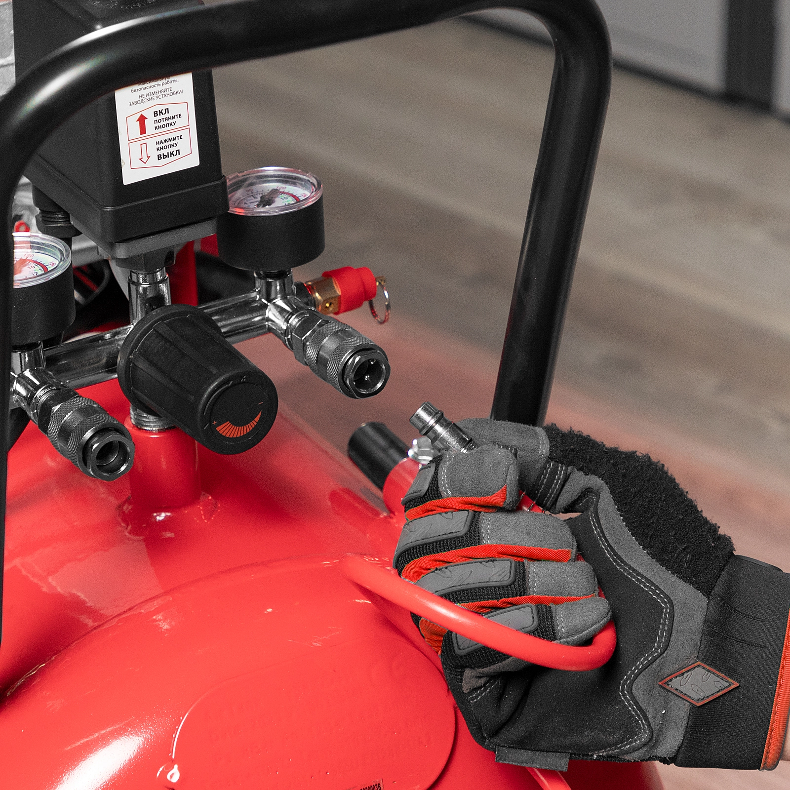 - Удобный контроль рабочих параметров — 2 манометра и регулятор позволяют отслеживать и корректировать давление для корректной работы пневмоинструмента.