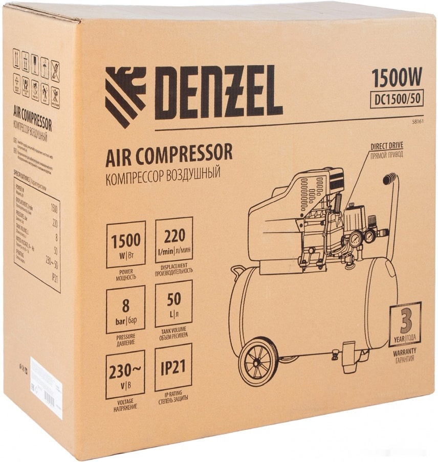 ПроизводителиКомпрессор воздушный прям. привод DC1500/50, 1,5 кВт, 50 литров, 220 л/мин Denzel