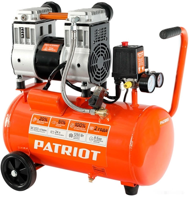 СТАНДАРТУровень качества. При классификации продуктов, имеющих схожее наименование, но обладающие различными потребительскими свойствами мы приняли следующий Вес факторов: 80% - подтвержденный ресурс, 15% - заявленная производительность/скорость, 5% - субъективные ощущения потребителя. ПодробнееКод товара: 0062425(0)ХарактеристикиАртикул 525301920Бренды PATRIOTСтрана производства КитайГарантия 24 месяцевТип поршневойПотребляемая мощность 1250Уровень звукового давления, дБ(A) 54Рабочее давление, Бар 8Число оборотов холостого хода 1380Цвет оранжевыйОбъем ресивера 24Тип двигателя электрическийКолеса естьТип смазки безмасляныйПривод прямойПроизводительность на входе 200Количество цилиндров 2Количество ступеней сжатия 1Уровень шума 54Ресивер горизонтальныйМаксимальное число оборотов 1380Ширина в упаковке 59Высота в упаковке 57Глубина в упаковке 27Описание товара обновлено 08.12.2025 15:23:02Напряжение - 220 В Рабочее давление - 8 бар Число оборотов - 1380 об/мин Производительность на входе - 200 л/мин Объем ресивера - 24 л Тип компрессора - поршневой коаксиальный (прямой привод) Мощность (кВт) - 1.25 Мощность (л.с.) - 1.7 Транспортировочные колеса - да Тип смазки - безмасляный Частотный преобразователь - нет Тип двигателя - электрический Кабель питания в комплекте - есть Min уровень шума - 54 дБ Частота - 50 Гц Цилиндры - 2 Ступени - 1 Комплектация Компрессор Комплект колес УпаковкаПроизводитель: 11th Flooor,LiYuanShangdu Building A2,201# LanTian Road,NingBo China