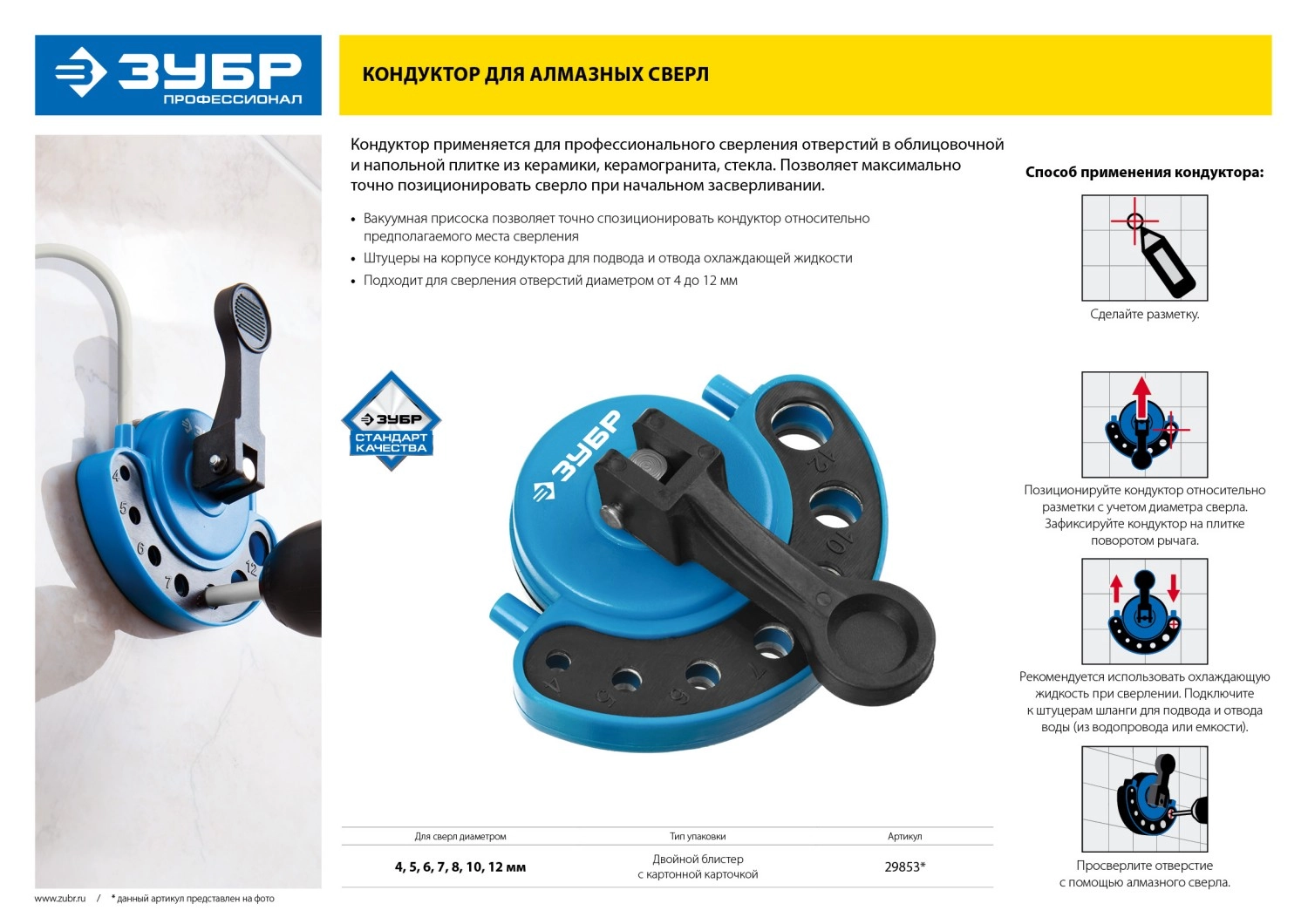 ПроизводителиКондуктор для сверл алмазных трубчатых, d=4-12мм "Профессионал" (29853) ЗУБР