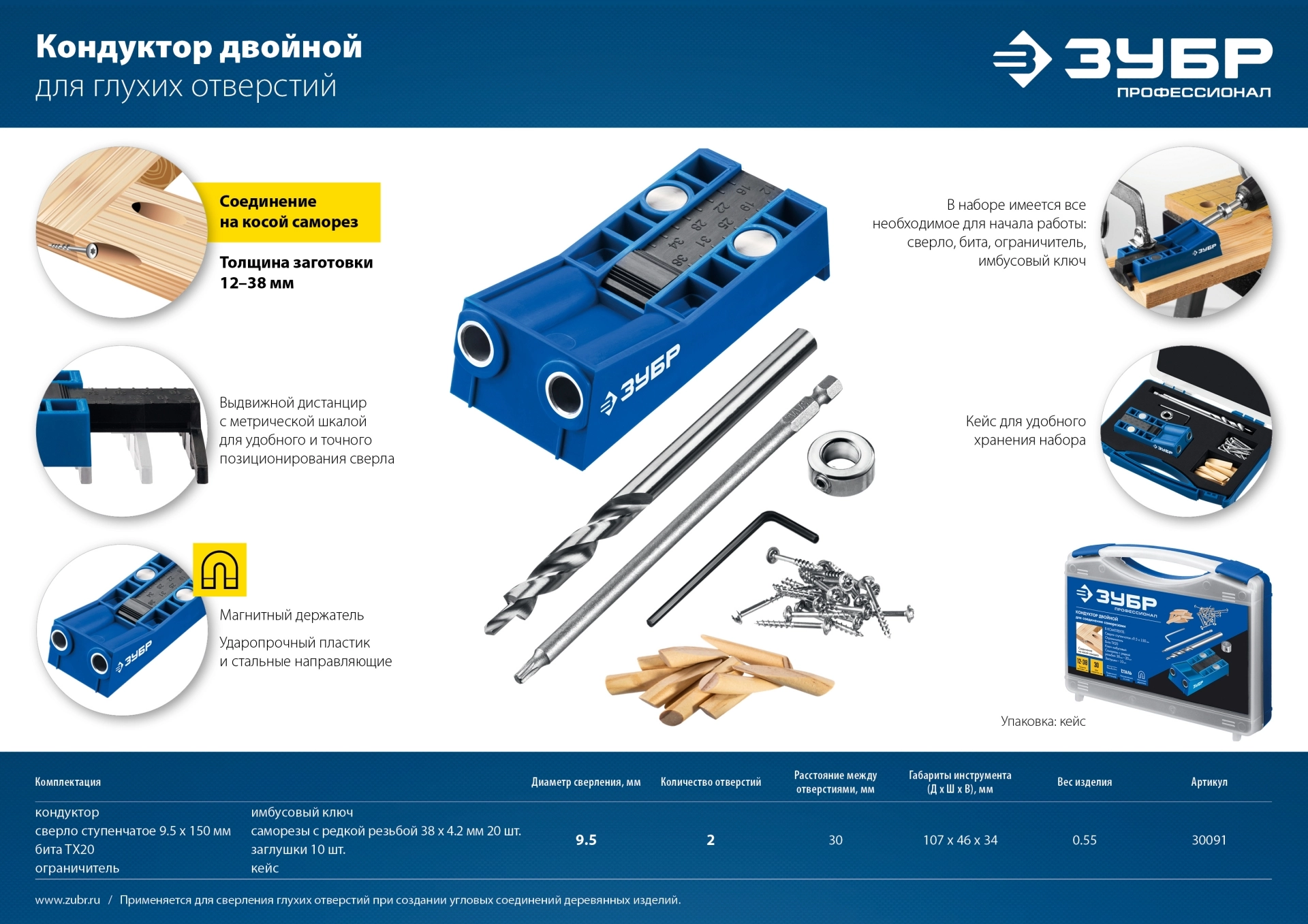 ПроизводителиКондуктор двойной для для глухих отверстий, два отверстия, набор (30091) ЗУБР