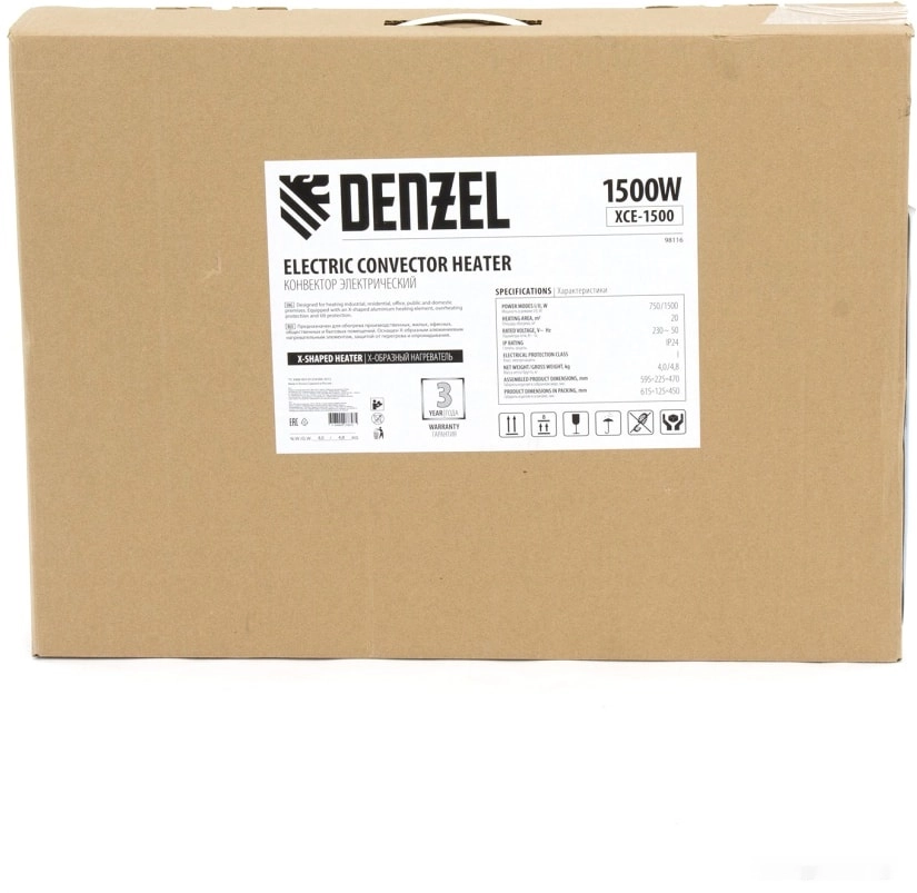 Бренд: DENZELЭлектрический конвектор Denzel XCE-1500 98131 белого цвета, максимальной мощностью 1500 Вт, с сушилкой для одежды, колесами и X-образным нагревательным элементом, работает от сети 230 В и предназначен для обогрева закрытых помещений площадью до 20 м2. Надежный и долговечный X-образный нагревательный элемент обеспечивает быстрый нагрев до необходимой температуры.