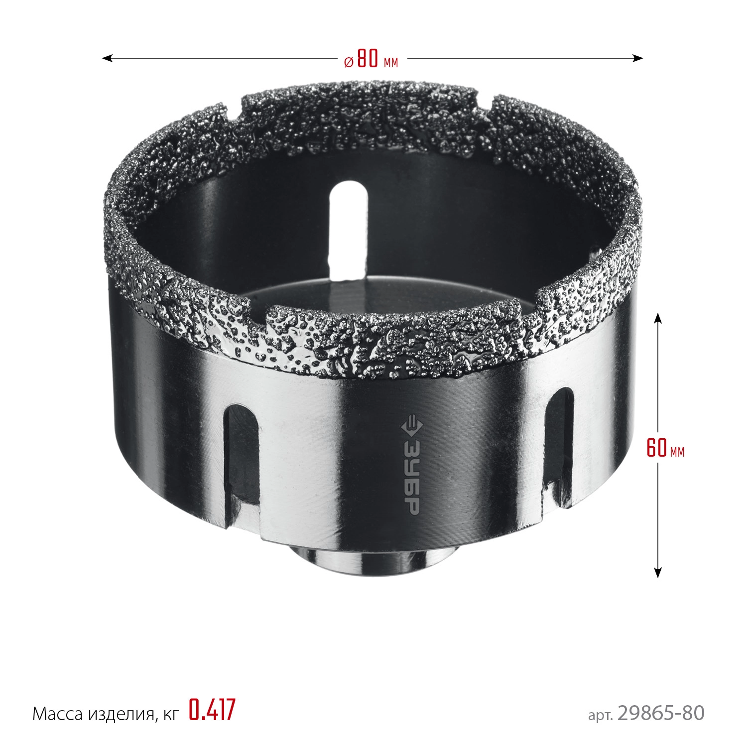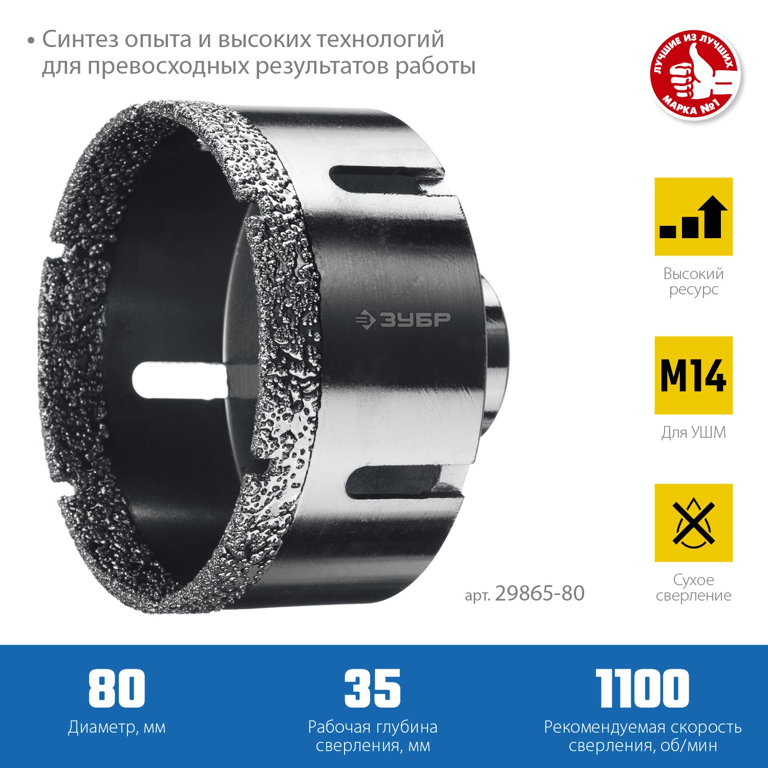 ПроизводителиКоронка алмазная 80мм, универсальная, технология ВВС, посадка М14 "Профессионал" (29865-80) ЗУБР