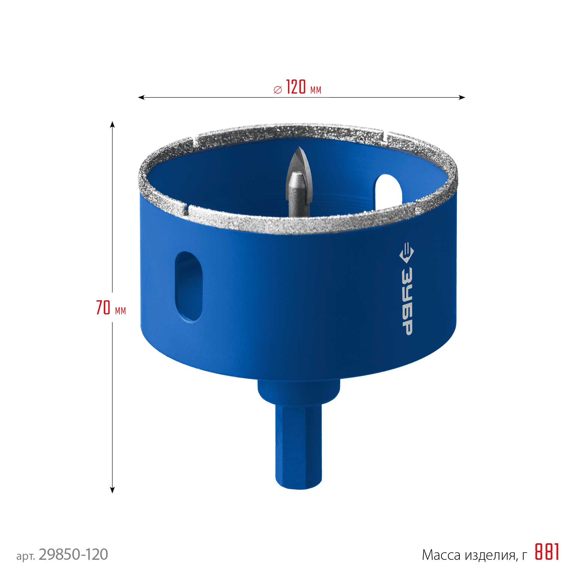 ПроизводителиКоронка алмазная 120мм, с центр.сверлом, зерно Р60, керам., кафель, стекло "ПРОФИ" (29850-120) ЗУБР