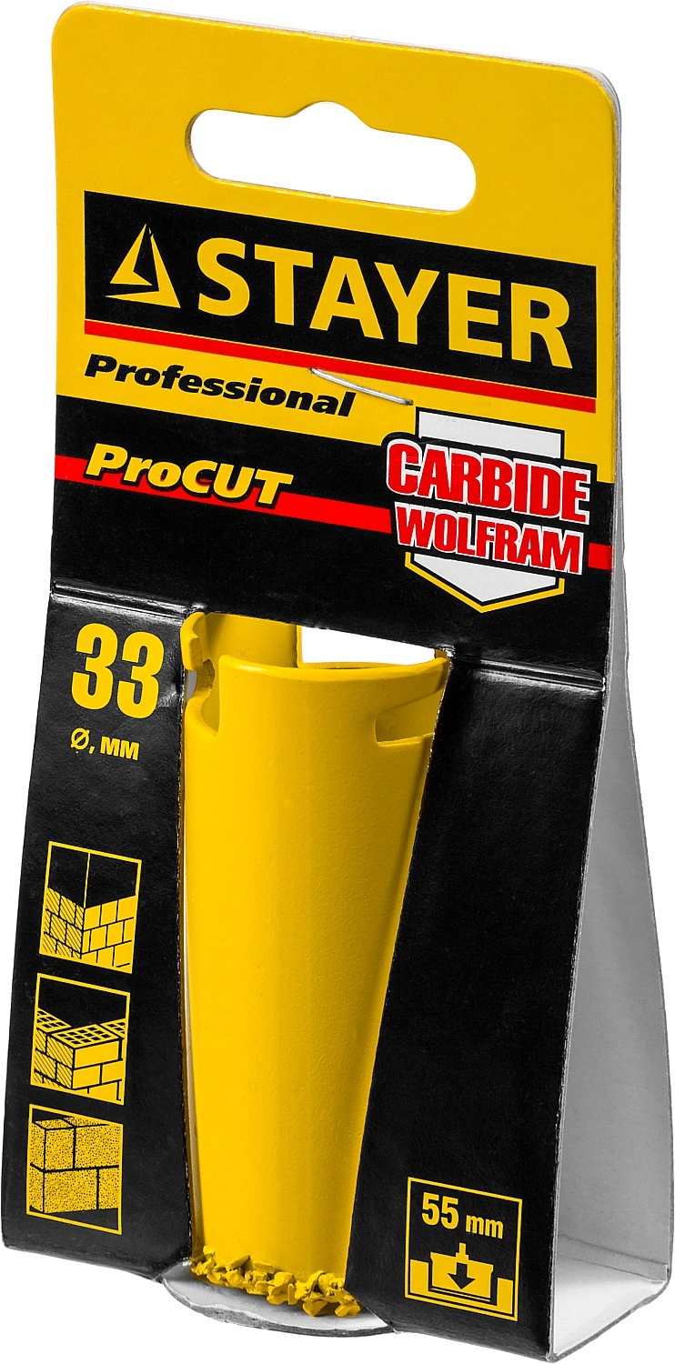 ПроизводителиКоронка кольцевая c карбид-вольф. покр., 33мм, высота 55мм "PROFESSIONAL" (33345-33) STAYER