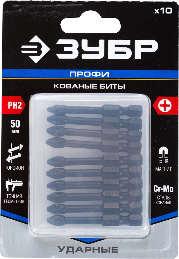 ПроизводителиБита PH2 L= 50мм, ударная, торсионная, 10шт. "ПРОФИ" (26021-2-50-S10) ЗУБР