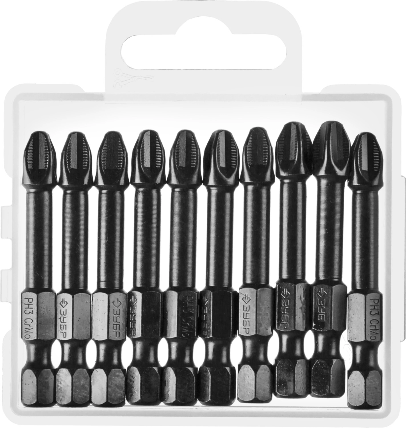 ПроизводителиБиты ЗУБР "ПРОФИ" Phillips, тип хвостовика E 1/4", PH3, 50мм, 10шт, в пластиковом боксе, на карточке