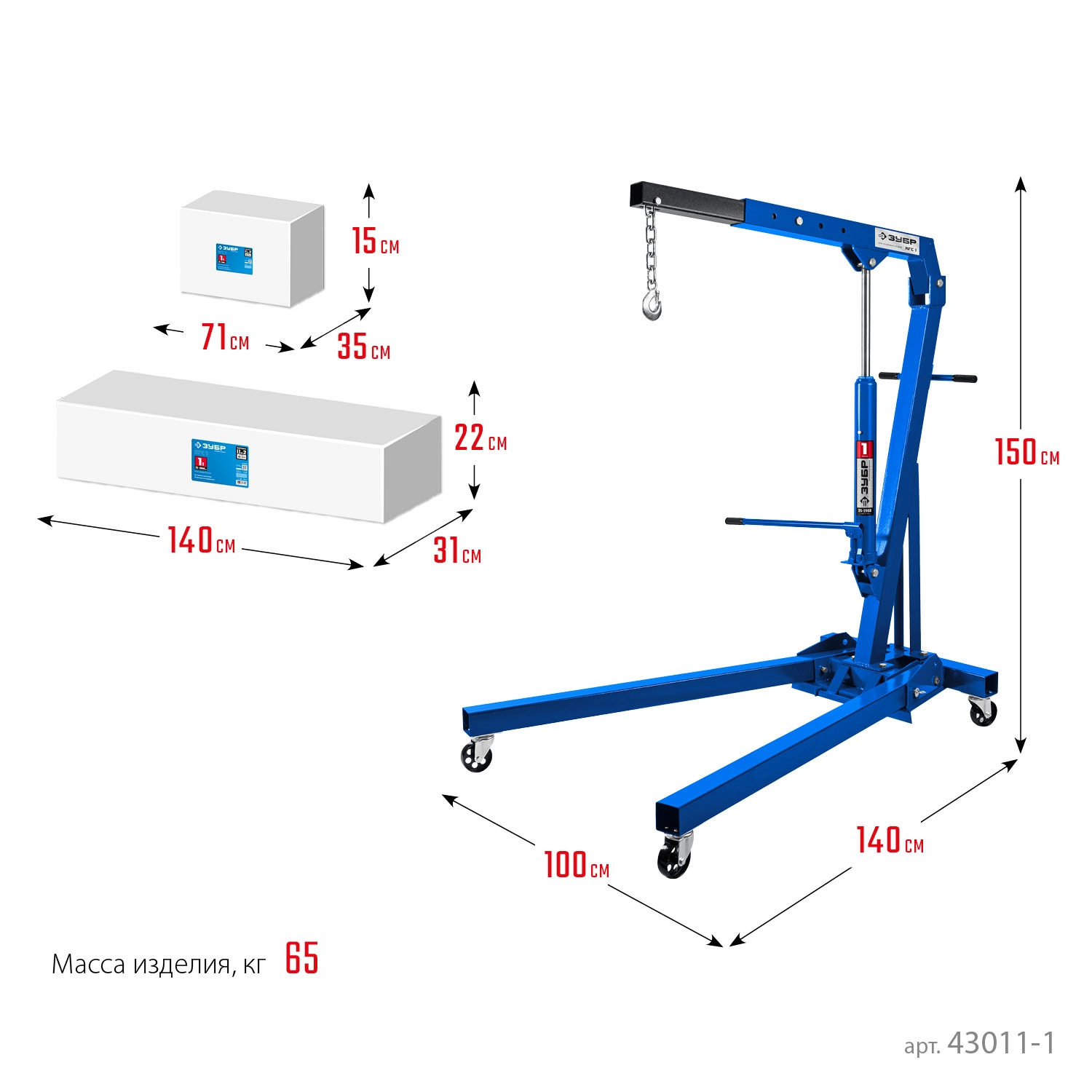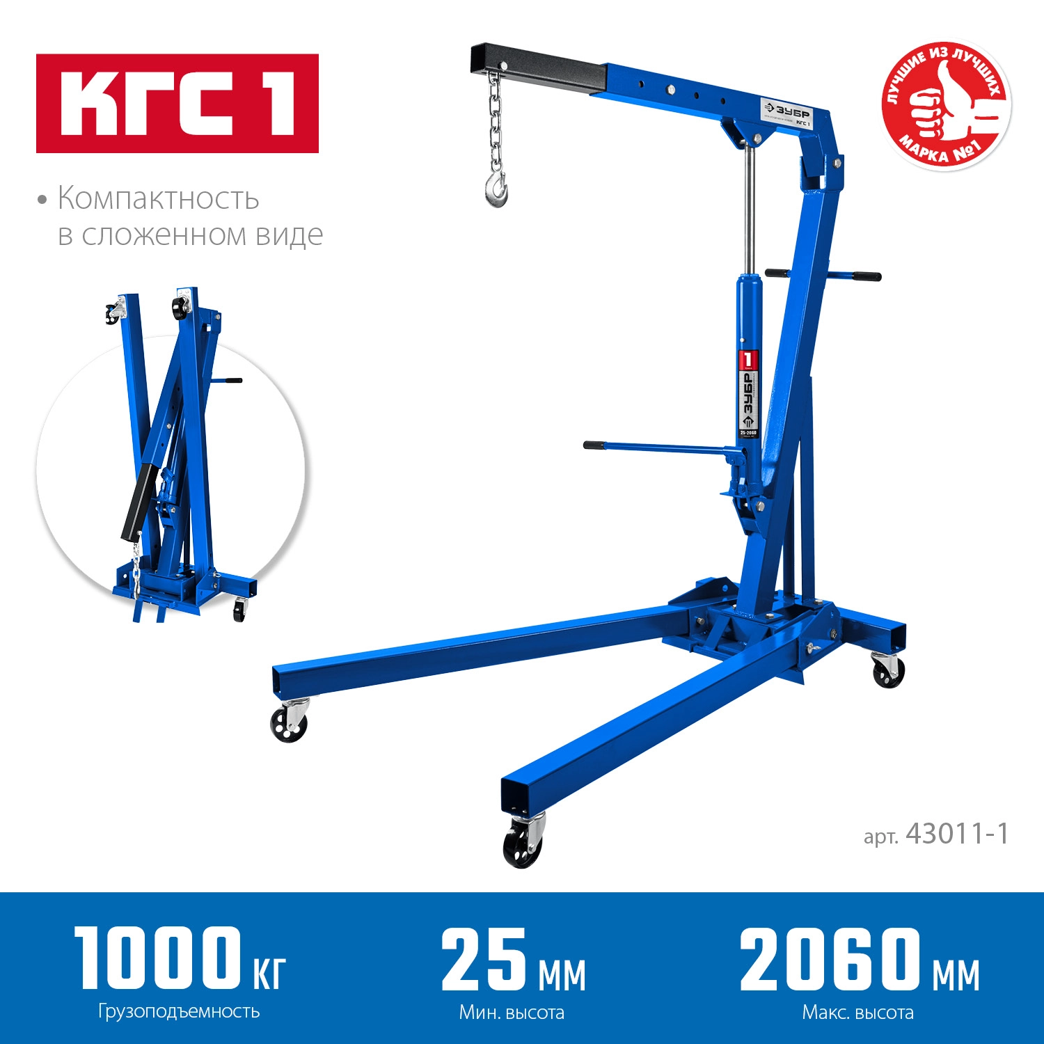 ПроизводителиКран гидравлический складной 25 - 2060мм, КГС-1, 1 т, Профессионал (43011-1) ЗУБР