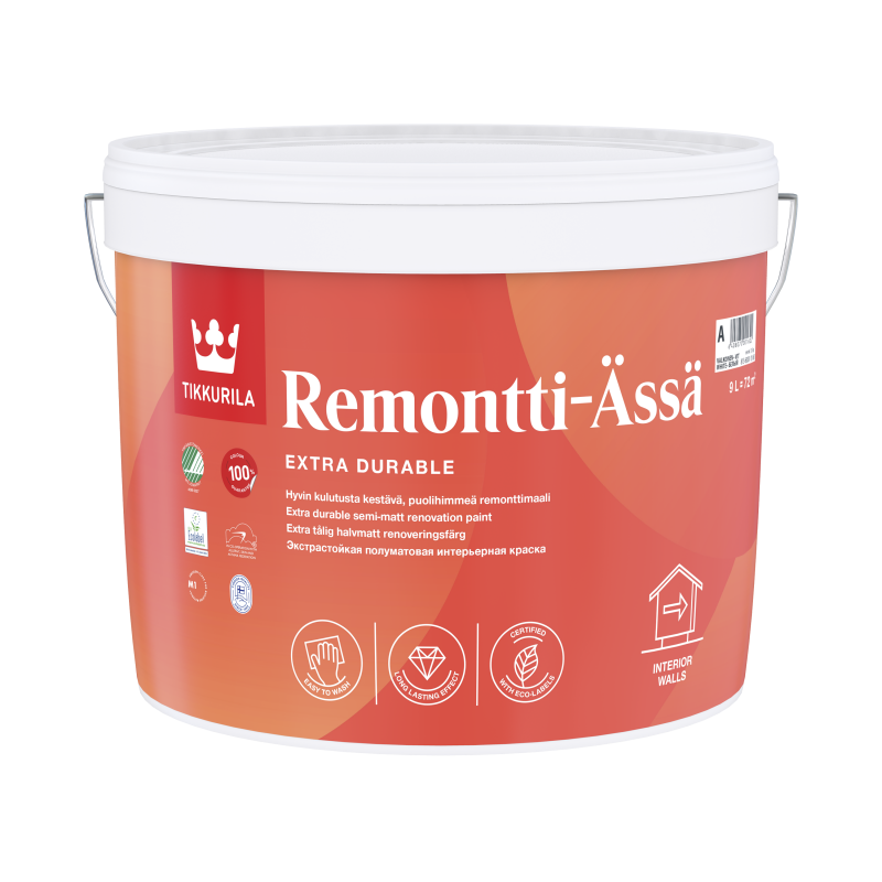 ЭКСПЕРТУровень качества. При классификации продуктов, имеющих схожее наименование, но обладающие различными потребительскими свойствами мы приняли следующий Вес факторов: 80% - подтвержденный ресурс, 15% - заявленная производительность/скорость, 5% - субъективные ощущения потребителя. ПодробнееКод товара: 0047093(0)ХарактеристикиАртикул 81560030130Бренды TikkurilaСтрана производства ФинляндияОбъем, л 2.7Область применения внутренняяНазначение / Применение бетон, кирпич, картон, дерево, гипсокартонЦвет бесцветныйТип основы акрилатнаяВремя высыхания, ч 2Расход материала 8-9м²/лКраска TIKKURILA REMONTTI-ASSA на акрилатной основе. Используется для окраски стен и потолков требующие частого мытья, например, на кухне. Подходит для окраски радиаторов отопления. Не рекомендуется для окраски мебели.Производитель: Tikkurila Group