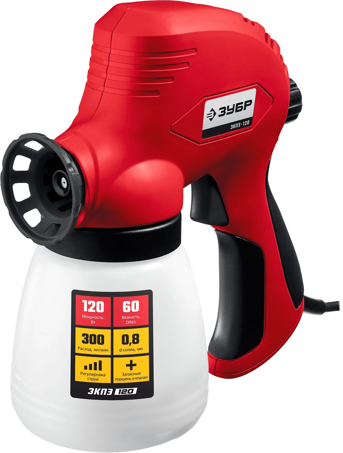 ПроизводителиКраскопульт (краскораспылитель) элект., 300 мл/мин, сопло 0.8 мм, 120 Вт (ЗКПЭ-120) ЗУБР