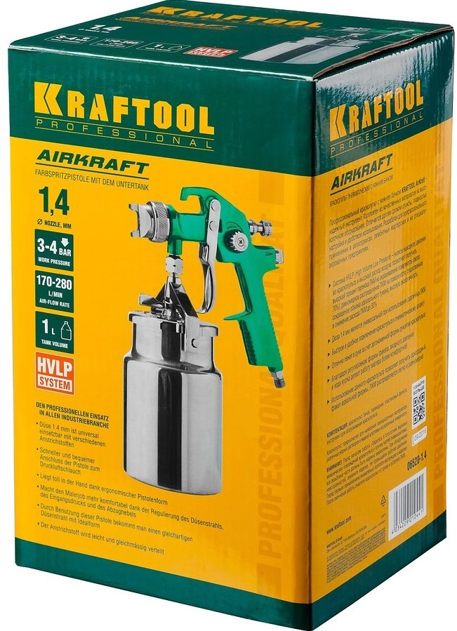ПроизводителиКраскопульт пневмат., HVLP, с нижним бачком, 1.4 мм AirKraft (06520-1.4) KRAFTOOL