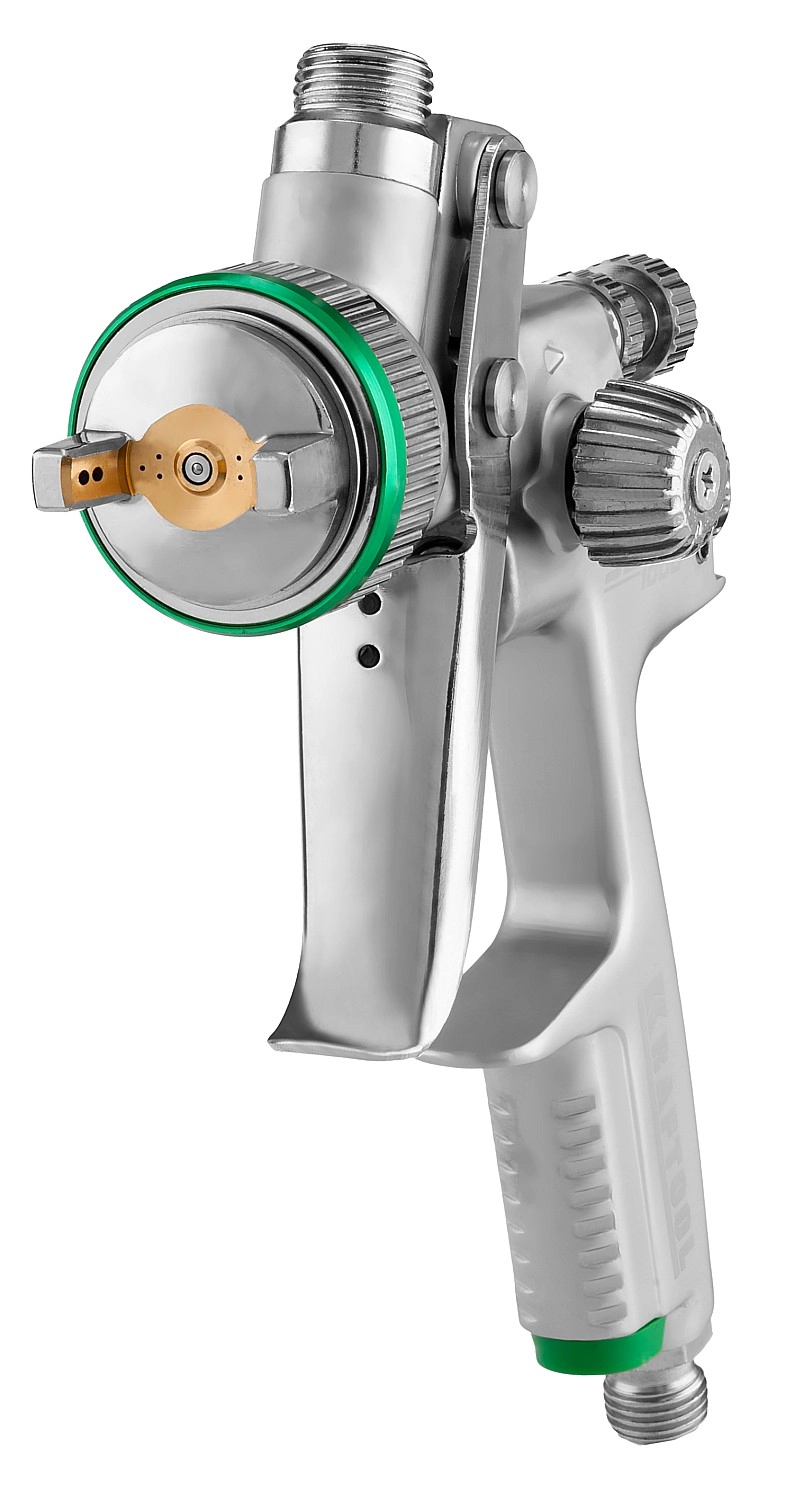 -Система HVLP (High Volume Low Pressure) - Низкое выходное давление из пистолета и высокий расход воздуха позволяют получить высокий процент переноса ЛКМ на окрашиваемую поверхность (около 70%), равномерное распределение ЛКМ на поверхности, существенное сокращение объема аэрозольного тумана, высокая экологичность и снижение расхода ЛКМ до 30%.