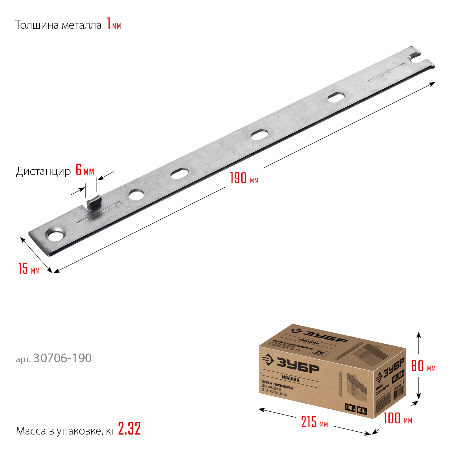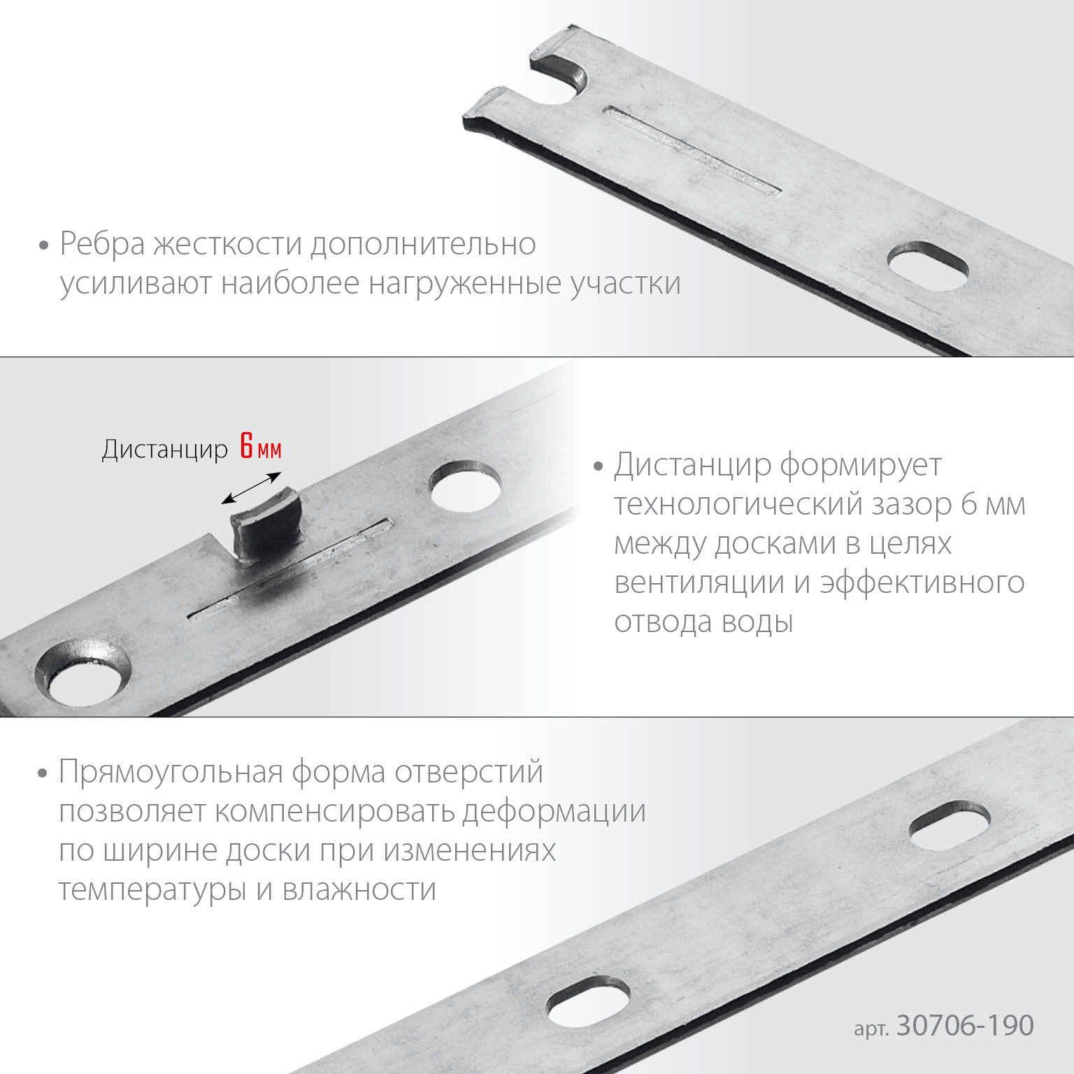 ПроизводителиКрепеж с дистанциром для фасадной и террасной доски, 100 шт, 190мм, цинк, Молния (30706-190) ЗУБР