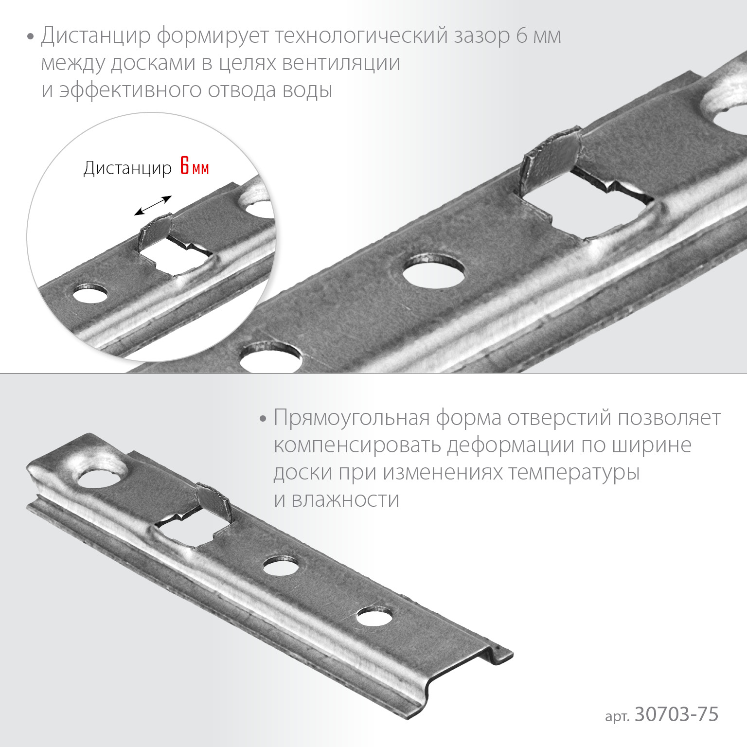 Дистанцир формирует зазор 6 мм между досками. Зазор необходим для вентиляции покрытия и его устойчивости к температурным колебаниям.