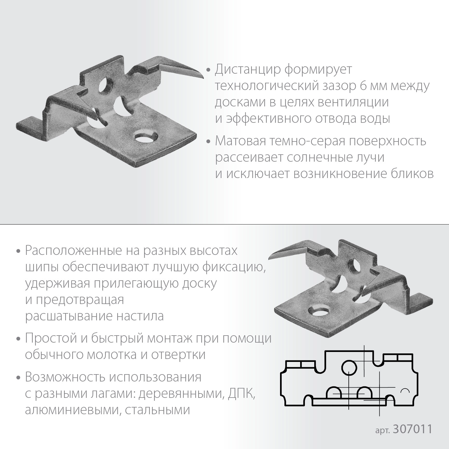 - Дистанцир формирует зазор 6 мм между досками.