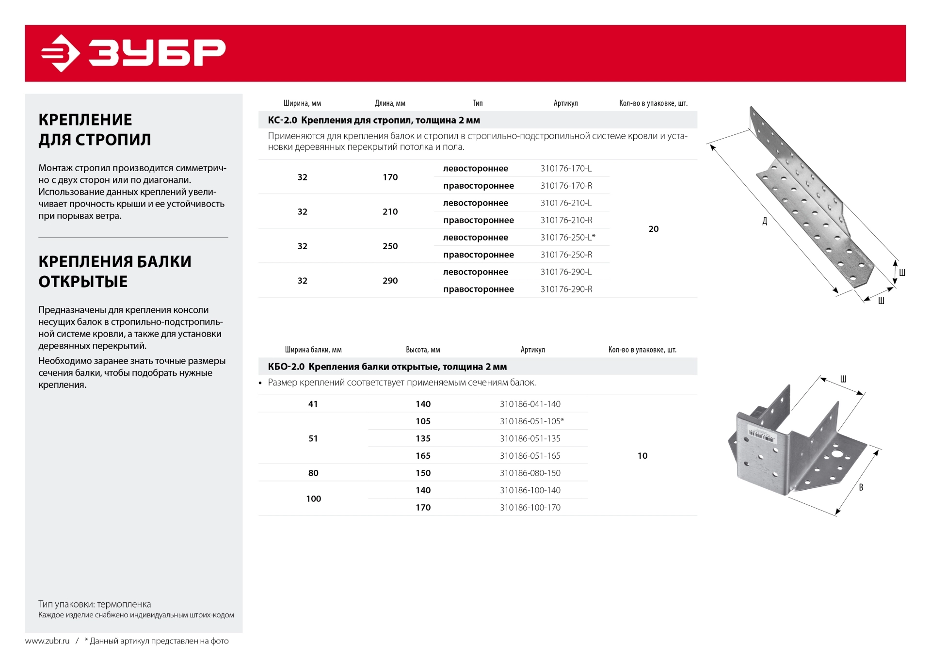 ПроизводителиКрепление балки открытое, цинк, 80х150х2мм, КБО-2.0 (310186-080-150) ЗУБР
