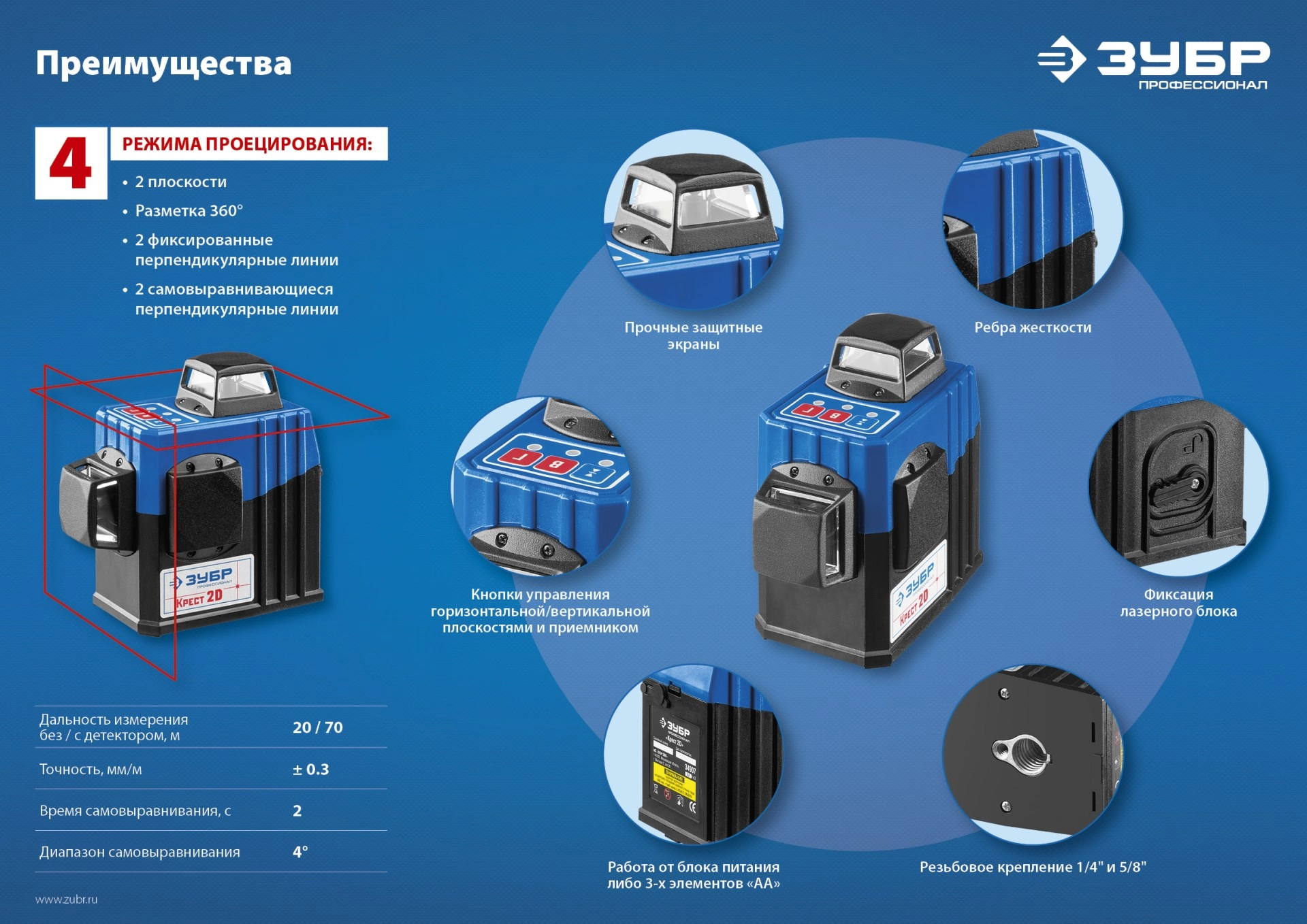 ПроизводителиНивелир лазерный линейный "КРЕСТ 2D №2" 2х360°, 20м/70м, точн. +/-0,3 мм/м, штатив (34907-2) ЗУБР