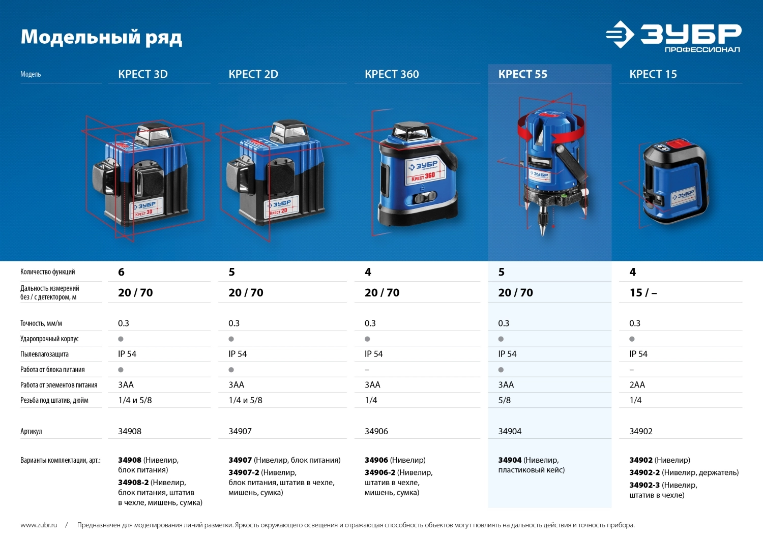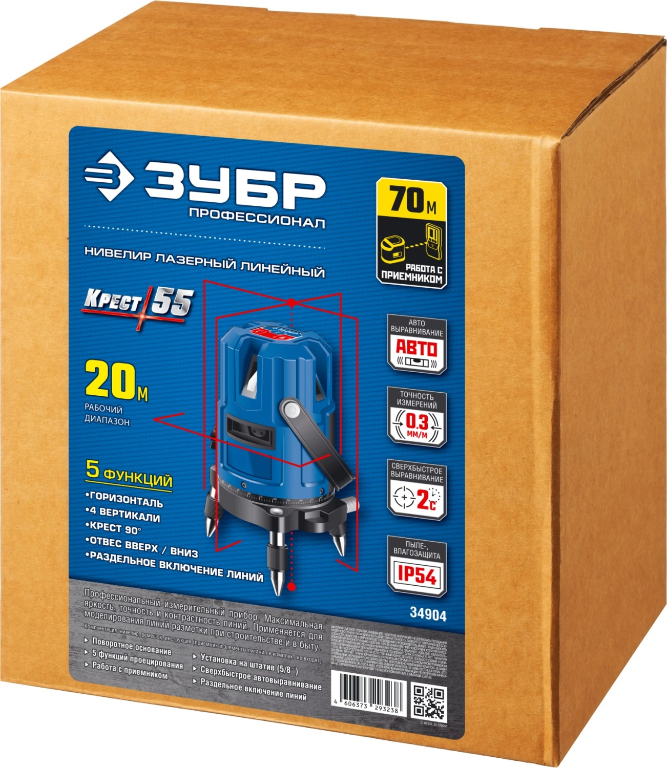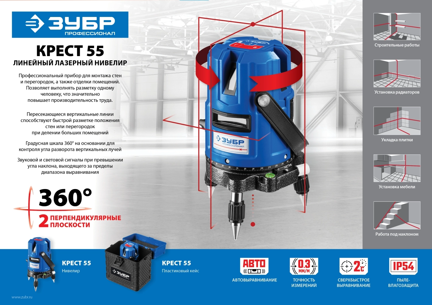 ПроизводителиНивелир лазерный линейный "Крест-55", 4 верт., 3 гориз. линии, 20м/70м, точн. 0,3 мм/м (34904) ЗУБР
