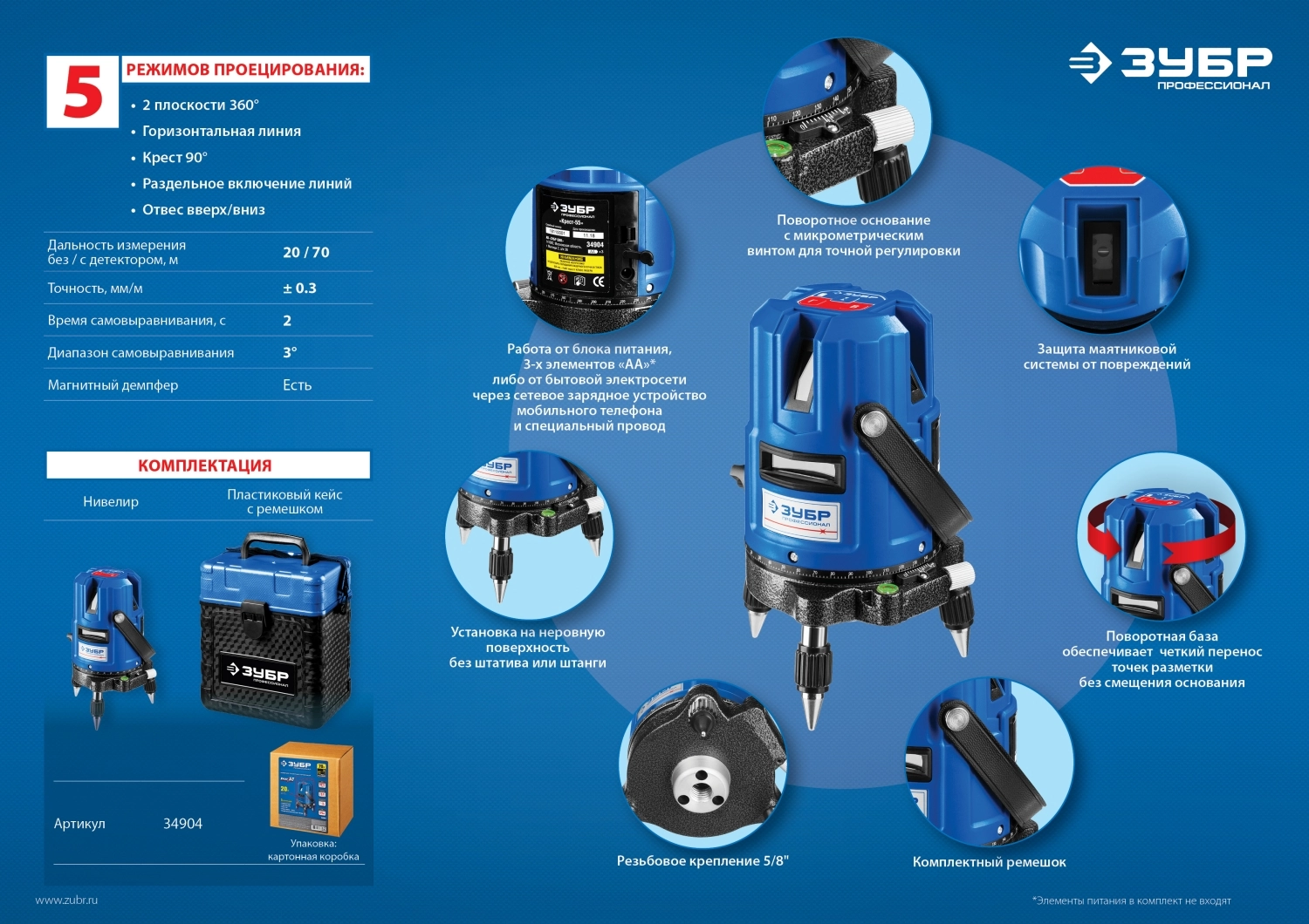 Лазерный уровень построитель плоскостей ЗУБР 34904, предназначен для генерирования горизонтальной, вертикальной и перпендикулярных линий при проведении разметочных работ. Пять режимов проецирования линий: четыре вертикальные линии образующие 2 плоскости по 360 градусов, самовыравнивающаяся горизонтальная линия, два креста, раздельное включение линий, отвес вниз. Функция автовыравнивания не требует настройки, обеспечивая повышенную точность при разметке. Диапазон компенсирования ± 3° для установки на неровную поверхность. Световая индикация при превышении порогового значения угла самовыравнивания. Возможность блокировки компенсатора для защиты маятниковой системы от механических повреждений. Магнитный демпфер позволяет быстро гасить колебания. Работа с детектором при высокой освещенности. Работа от батареек и блока питания AC/DC. Предусмотрена установка на штатив (резьба 5/8").Производитель: Крафтул И/Е Гмбх, Альтер Поствег Штр., Лоенинген, Германия