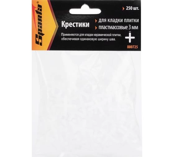 Крестики для кладки плитки Sparta 880725 толщиной 3,0 мм, 250 шт. в упаковке, позволяют добиться одинакового межплиточного расстояния в ходе облицовочных работ. Облегчают укладку плиточного покрытия и обеспечивают ему эстетичный внешний вид.