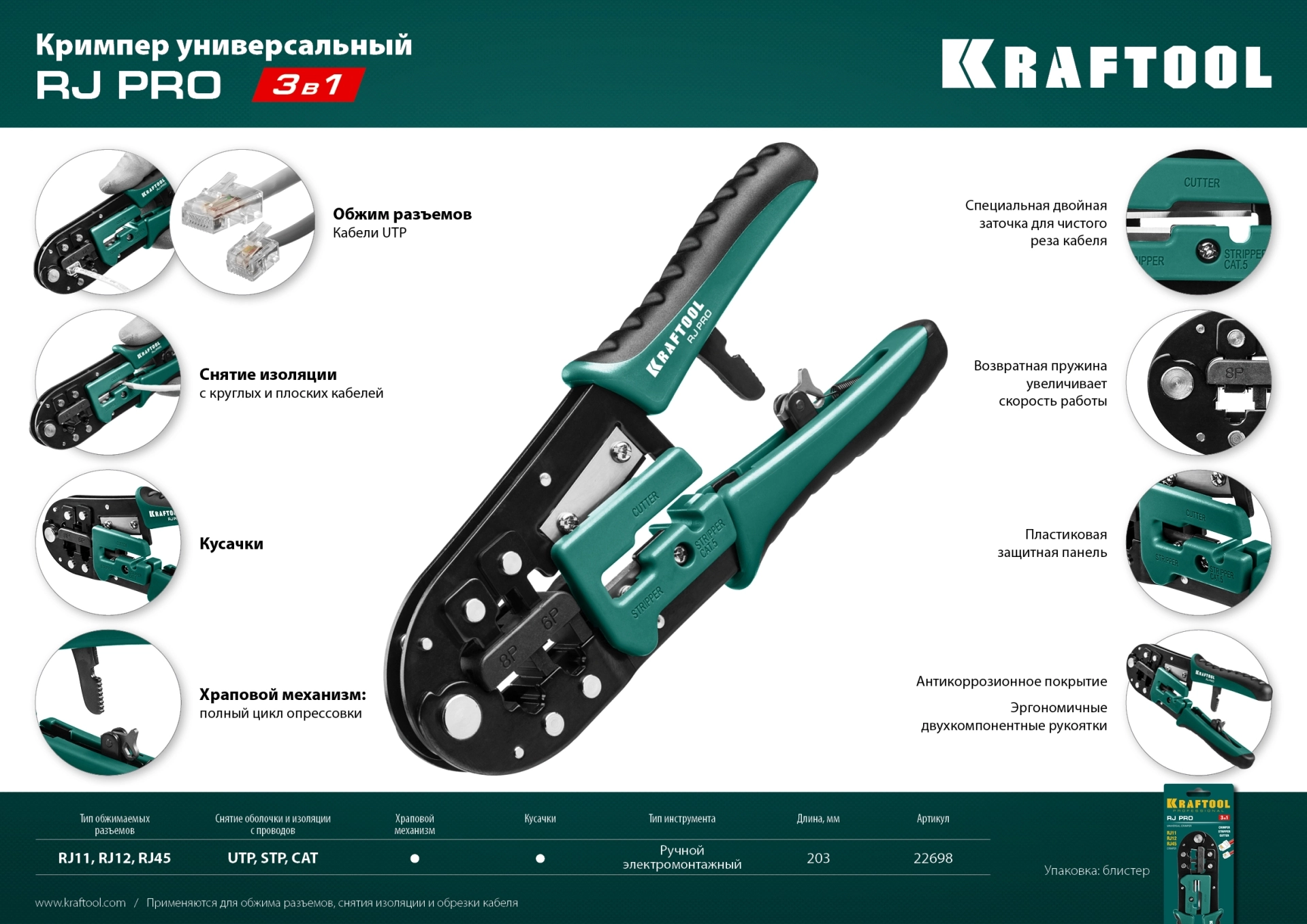 ПроизводителиКримпер универсальный RJ-Pro RJ45 RJ11/RJ12 (22698) KRAFTOOL