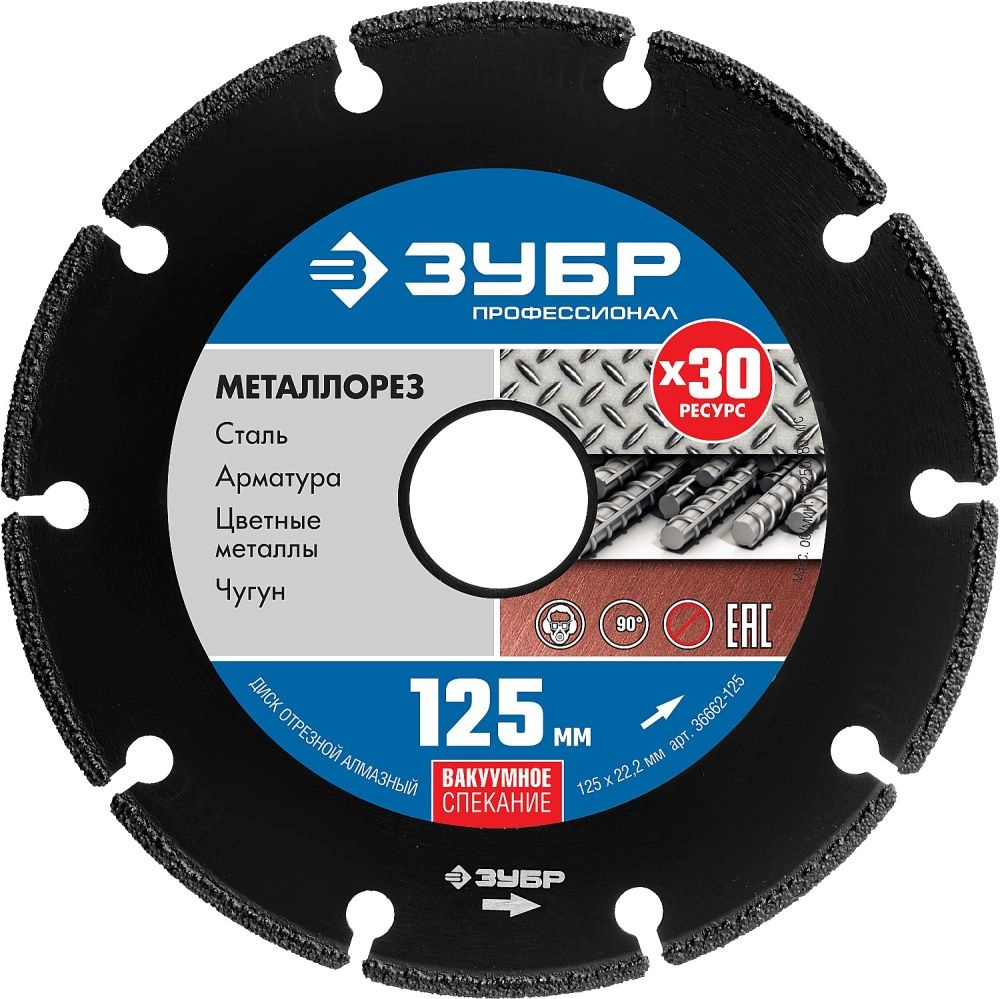 ПроизводителиКруг алмазный сегм. 125х1.6х22.23 мм ВВС-напыление "Металлорез" (36662-125) ЗУБР