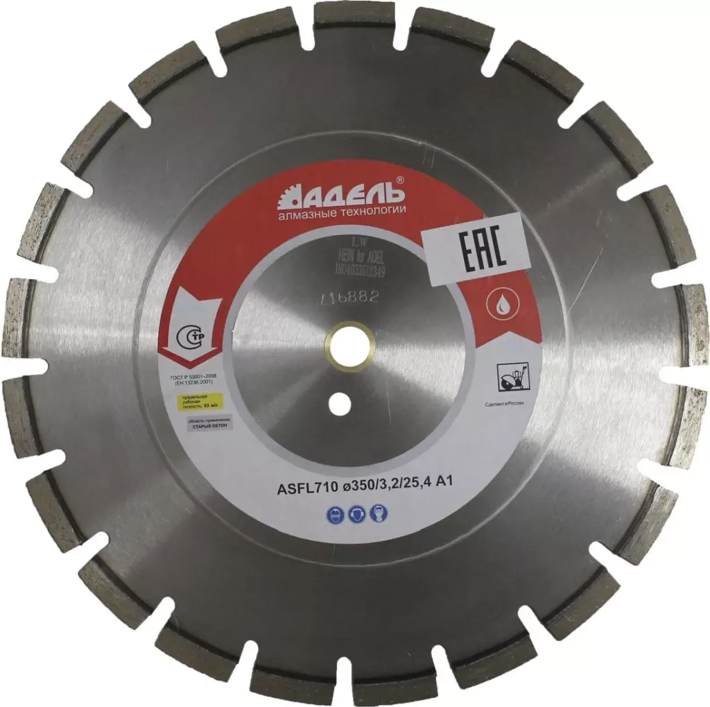 Особенности: Универсальный диск с лазерной напайкой сегментов. Отличается высочайшими режущими свойствами, скоростью и плавностью прохождения слоёв армирования.