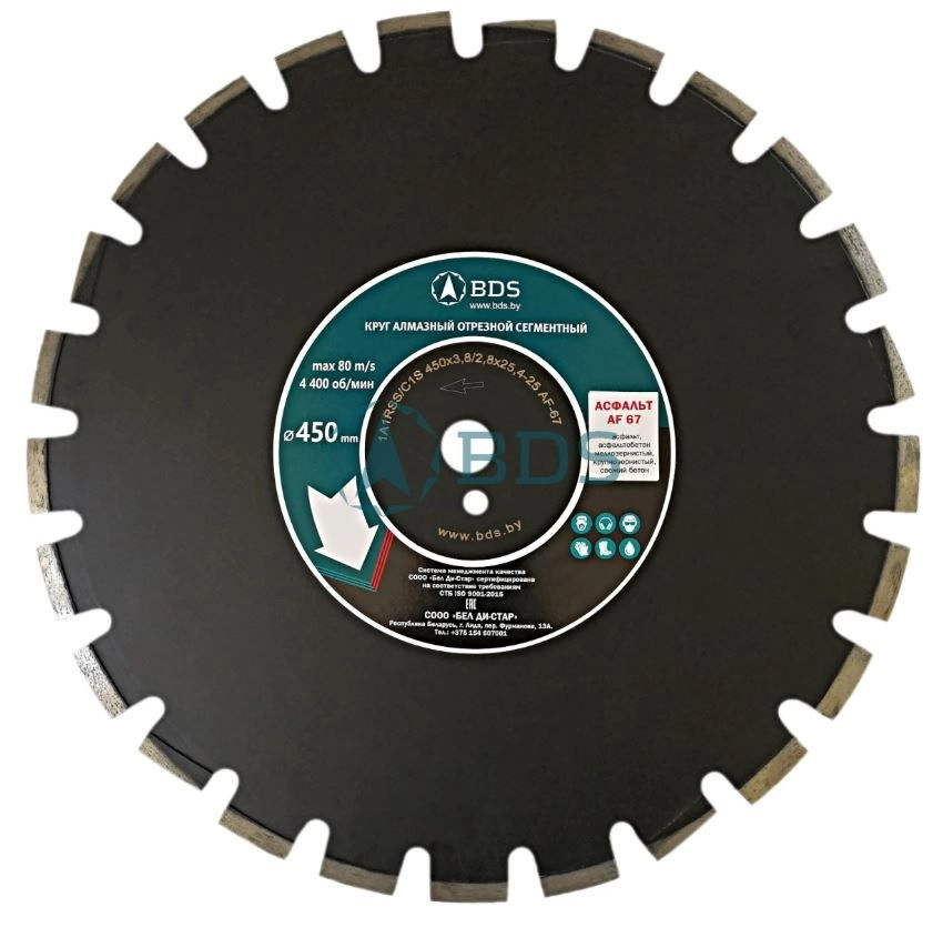 ХарактеристикиАртикул 0080991Бренды Бел Ди-СтарСтрана производства БеларусьТип изделия СегментныйОбласть применения бензорез, швонарезчикПосадочный диаметр 25,4Алмазный слой, мм 10Толщина круга 3.8Диаметр диска 450Алмазный диск BDS 1A1RSS/C1S AF-67 450x3,8/2,8x10x25,4x11,5-25 создан для мокрой резки асфальта, свежего бетона, асфальтобетона и гидротехнического бетона на швонарезчиках средней и высокой мощности (от 11 кВт). Имеет повышенный ресурс, мягкий и ровный рез. Наличие скошенных "зубов" приводит к росту скорости резания и снижению износа корпуса круга.Производитель: СООО "Бел Ди-Стар", 231281, Гродненская обл., г.Лида, пер.Фурманова,13а