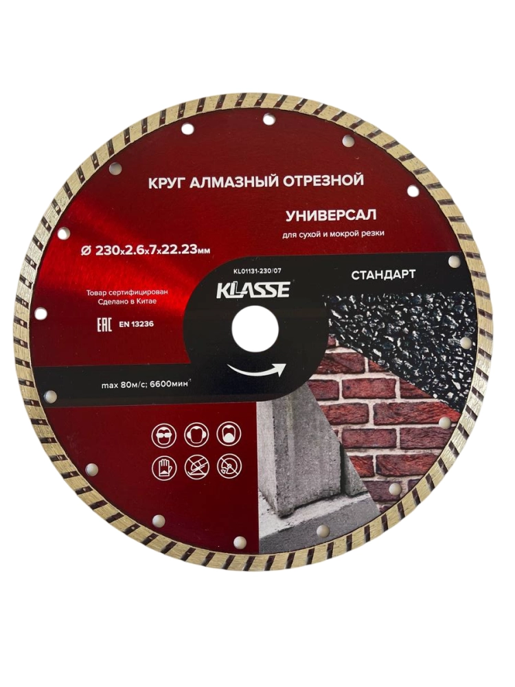 ПроизводителиКруг алмазный турбо 230х2.6х7x22.23 мм Универсал "Стандарт" (KL01131-230/07) KLASSE