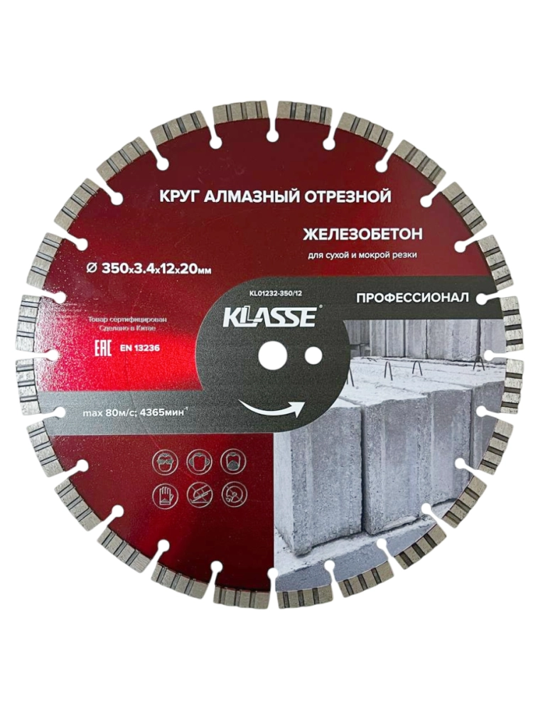 ПроизводителиКруг алмазный турбо-сегмент 350х3.2х12х20.0 мм ЖЕЛЕЗОБЕТОН "Профи" NEW (KL01232-350/12 NEW) KLASSE